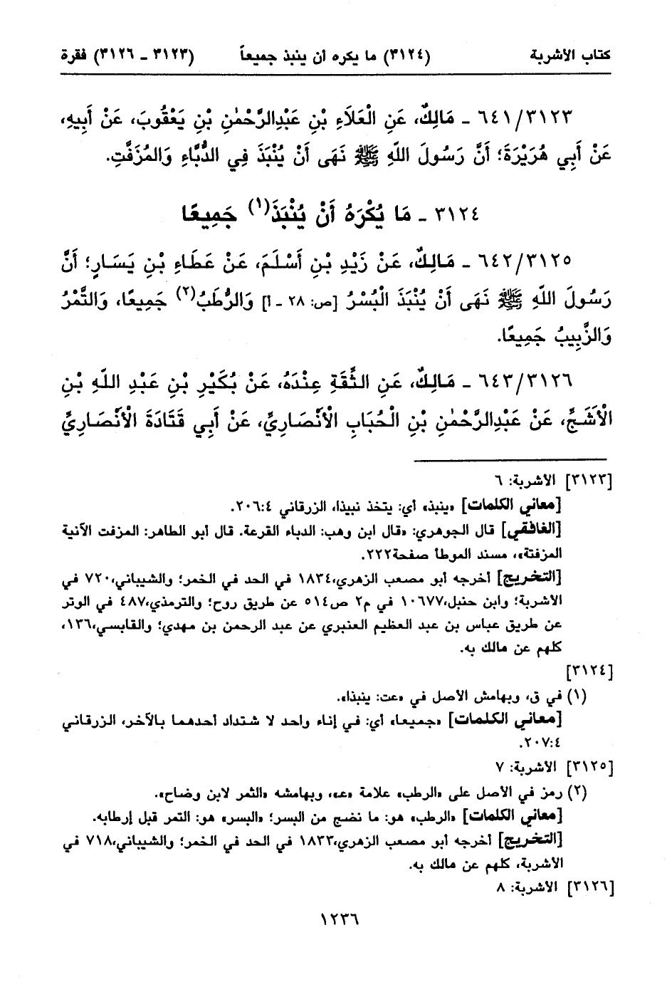 ٣١٢٦/ ٦٤٣ - مَالِكٌ، عَنِ الثِّقَةِ عِنْدَهُ، عَنْ بُكَيْرِ بْنِ عَبْدِ اللهِ بْنِ الْأَشَجِّ، عَنْ عَبْدِ الرَّحْمنِ بْنِ الْحُبَابِ الْأَنْصَارِيِّ، عَنْ أَبِي قَتَادَةَ الْأَنْصَارِيِّ ⦗١٢٣٧⦘[ف: ٣١٩]؛ أَنَّ رَسُولَ اللهِ صلى الله عليه وسلم نَهَى أَنْ يُشْرَبَ (١) التَّمْرُ وَالزَّبِيبُ جَمِيعاً، وَالزَّهْوُ وَالرُّطَبُ جَمِيعاً