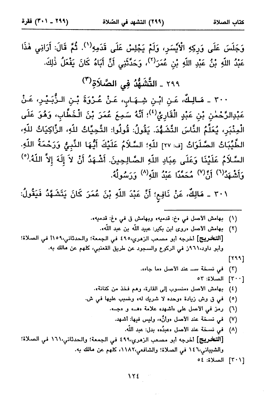 ٣٠٠ - مَالِكٌ، عَنِ ابْنِ شِهَابٍ، عَنْ عُرْوَةَ بْنِ الزُّبَيْرِ، عَنْ عَبْدِ الرَّحْمنِ بْنِ عَبْدٍ الْقَارِيِّ (١)؛ أَنَّهُ سَمِعَ عُمَرَ بْنَ الْخَطَّابِ، وَهُوَ عَلَى الْمِنْبَرِ، يُعَلِّمُ النَّاسَ التَّشَهُّدَ. يَقُولُ: قُولُوا: التَّحِيَّاتُ للهِ، الزَّاكِيَاتُ للهِ، الطَّيِّبَاتُ الصَّلَوَاتُ [ف: ٢٧] للهِ؛ السَّلَامُ عَلَيْكَ أَيُّهَا النَّبِيُّ وَرَحْمَةُ اللهِ. السَّلَامُ عَلَيْنَا وَعَلَى عِبَادِ اللهِ الصَّالِحِينَ. أَشْهَدُ أَنْ لَا إِلَهَ إِلَاّ اللهُ. (٢) وَأَشْهَدُ (٣) أَنَّ (٤) مُحَمَّداً عَبْدُ اللهِ (٥) وَرَسُولُهُ.