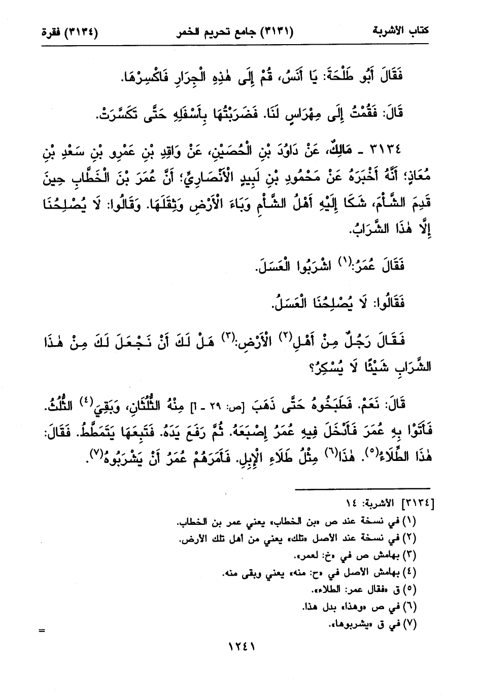 ٣١٣٤ - مَالِكٌ، عَنْ دَاوُدَ بْنِ الْحُصَيْنِ، عَنْ وَاقِدِ بْنِ عَمْرِو بْنِ سَعْدِبْنِ مُعَاذٍ؛ أَنَّهُ أَخْبَرَهُ عَنْ مَحْمُودِ بْنِ لَبِيدٍ الْأَنْصَارِيِّ؛ أَنَّ عُمَرَ بْنَ الْخَطَّابِ حِينَ قَدِمَ الشَّأْمَ، شَكَا إِلَيْهِ أَهْلُ الشَّأْمِ وَبَاءَ الْأَرْضِ وَثِقَلَهَا. وَقَالُوا: لَا يُصْلِحُنَا إِلَاّ هذَا الشَّرَابُ.