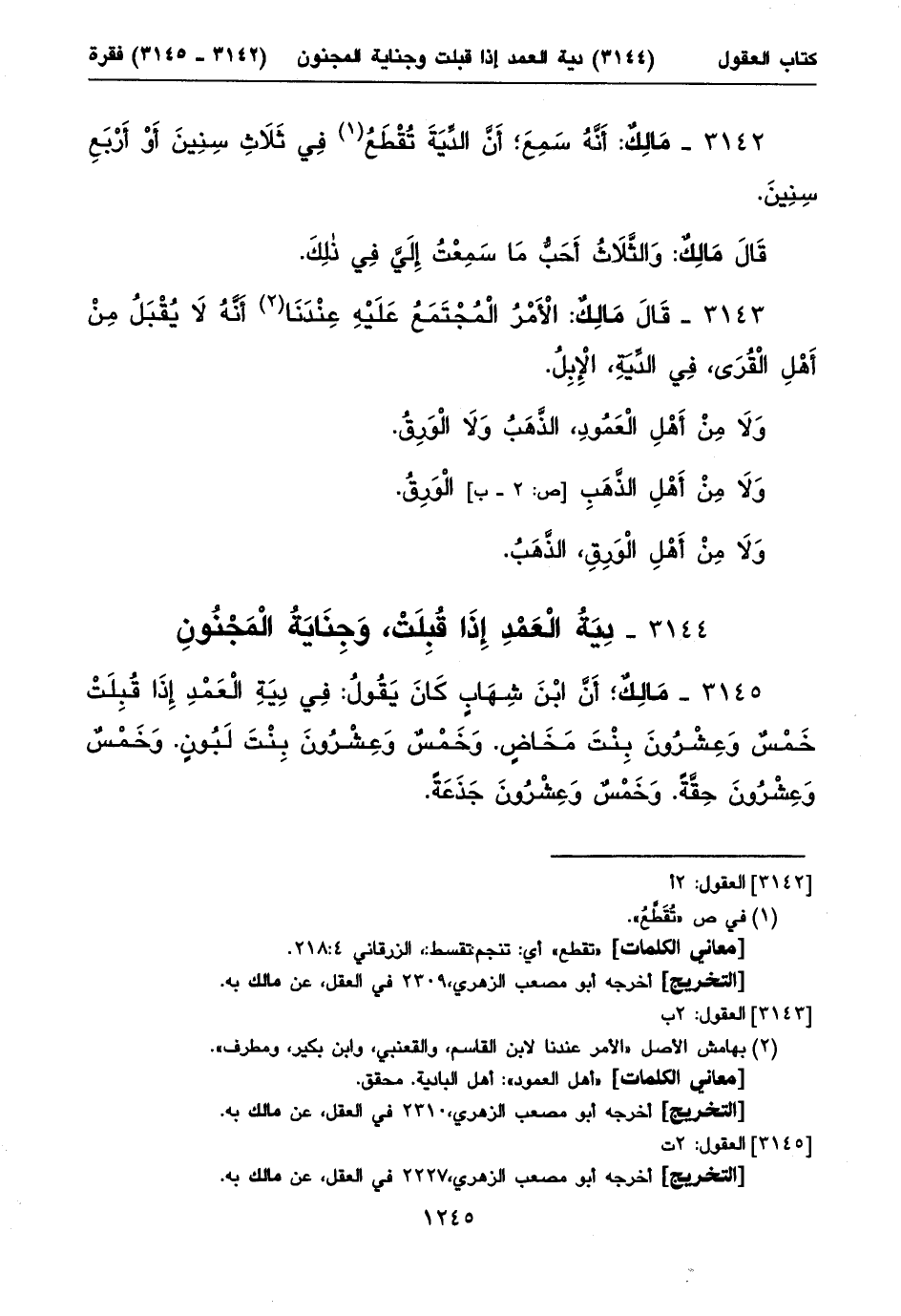 ٣١٤٤ - دِيَةُ الْعَمْدِ إِذَا قُبِلَتْ، وَجِنَايَةُ الْمَجْنُونِ