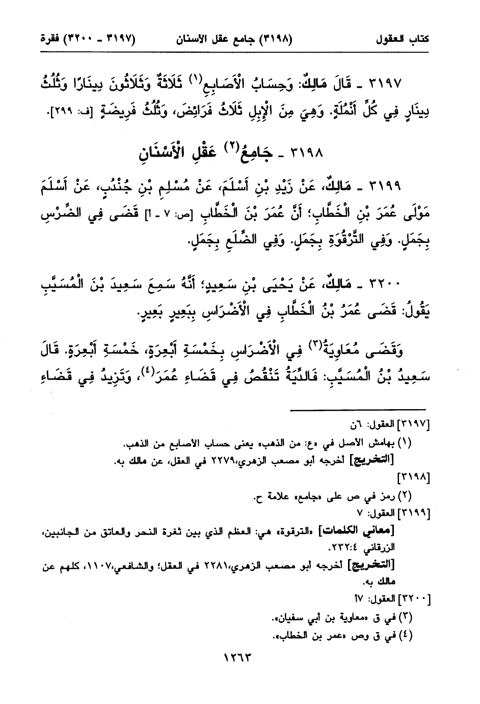 ٣١٩٩ - مَالِكٌ، عَنْ زَيْدِ بْنِ أَسْلَمَ، عَنْ مُسْلِمِ بْنِ جُنْدُبٍ، عَنْ أَسْلَمَ مَوْلَى عُمَرَ بْنِ الْخَطَّابِ؛ أَنَّ عُمَرَ بْنَ الْخَطَّابِ [ص: ٧ - أ] قَضَى فِي الضِّرْسِ بِجَمَلٍ. وَفِي التَّرْقُوَةِ بِجَمَلٍ. وَفِي الضِّلَعِ بِجَمَلٍ.