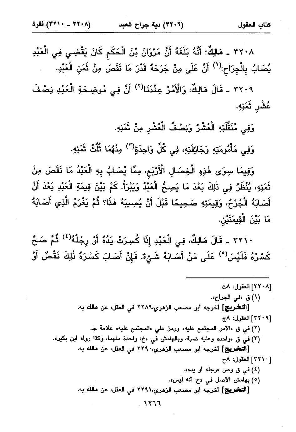 ٣٢٠٨ - مَالِكٌ؛ أَنَّهُ بَلَغَهُ أَنَّ مَرْوَانَ بْنَ الْحَكَمِ كَانَ يَقْضِي فِي الْعَبْدِ يُصَابُ بِالْجِرَاحِ: (١) أَنَّ عَلَى مِنْ جَرَحَهُ قَدْرَ مَا نَقَصَ مِنْ ثَمَنِ الْعَبْدِ.