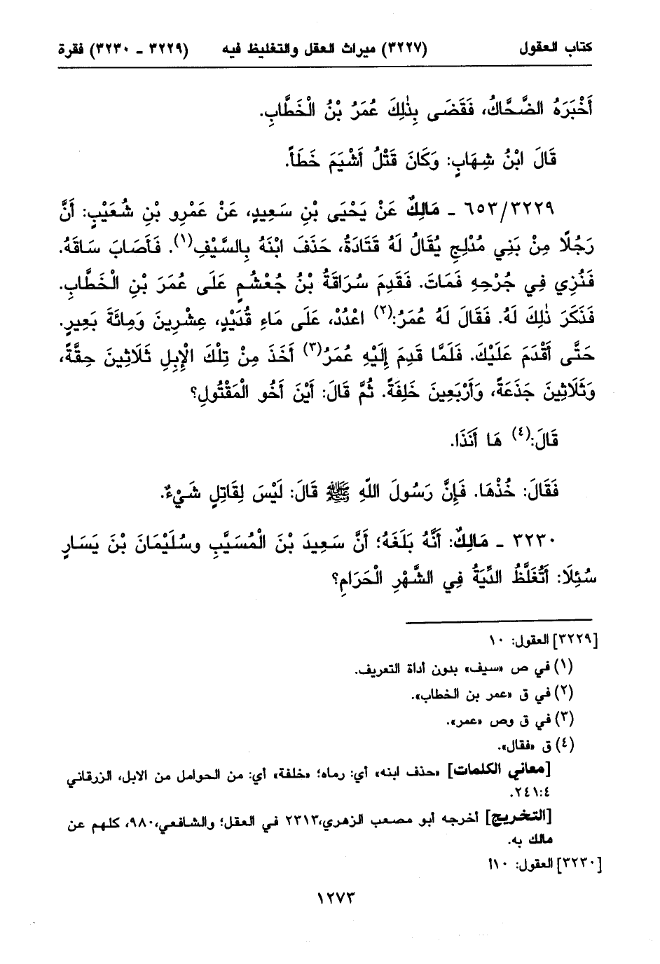 « .. أراهما أرادا مثل الذي صنع عمر .. » أي: من جعل الدية أثلاثا ٣٠ حقة و ٣٠ جذعة و ٤٠ خلفة، الزرقاني ٤: ٢٤٢