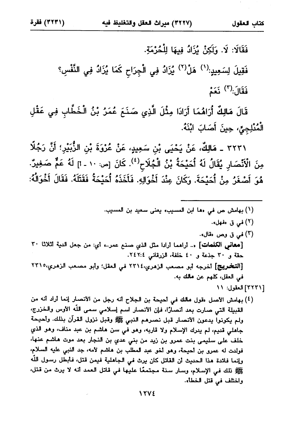٣٢٣١ - مَالِكٌ، عَنْ يَحْيَى بْنِ سَعِيدٍ، عَنْ عُرْوَةَ بْنِ الزُّبَيْرِ؛ أَنَّ رَجُلاً مِنَ الْأَنْصَارِ يُقَالُ لَهُ أُحَيْحَةُ بْنُ الْجُلَاحِ (١). كَانَ [ص: ١٠ - أ] لَهُ عَمٌّ صَغِيرٌ. هُوَ أَصْغَرُ مِنْ أُحَيْحَةَ. وَكَانَ عِنْدَ أَخْوَالِهِ. فَأَخَذَهُ أُحَيْحَةُ فَقَتَلَهُ. فَقَالَ أَخْوَالُهُ: ⦗١٢٧٥⦘ كُنَّا أَهْلَ ثُمِّهِ وَرُمِّهِ (٢). حَتَّى إِذَا اسْتَوَى عَلَى عَمَمِهِ (٣) غَلَبَنَا حَقُّ امْرِئٍ فِي عَمِّهِ. فَقَالَ (٤) عُرْوَةُ: فَلِذلِكَ لَا يَرِثُ قَاتِلٌ مَنْ قَتَلَ.