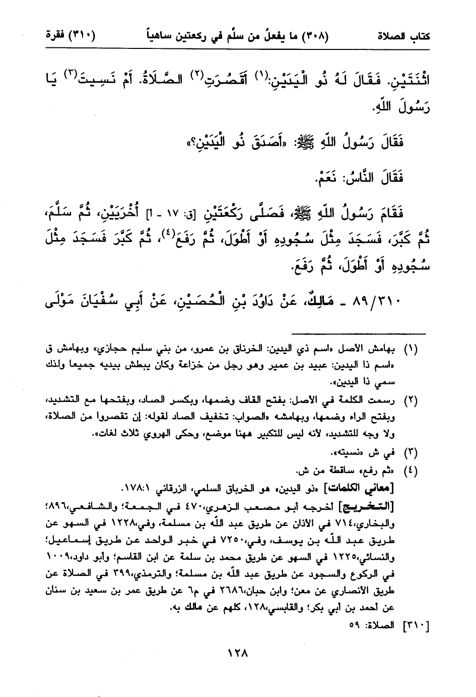 ٣١٠/ ٨٩ - مَالِكٌ، عَنْ دَاوُدَ بْنِ الْحُصَيْنِ، عَنْ أَبِي سُفْيَانَ مَوْلَى ⦗١٢٩⦘ ابْنِ أَبِي أَحْمَدَ؛ أَنَّهُ قَالَ: سَمِعْتُ أَبَا هُرَيْرَةَ يَقُولُ: صَلَّى رَسُولُ اللهِ صلى الله عليه وسلم صَلَاةَ الْعَصْرِ، فَسَلَّمَ فِي رَكْعَتَيْنِ. فَقَامَ ذُو الْيَدَيْنِ، فَقَالَ: أَقَصُرَتِ (١) الصَّلَاةُ يَا رَسُولَ اللهِ، أَمْ نَسِيتَ؟
