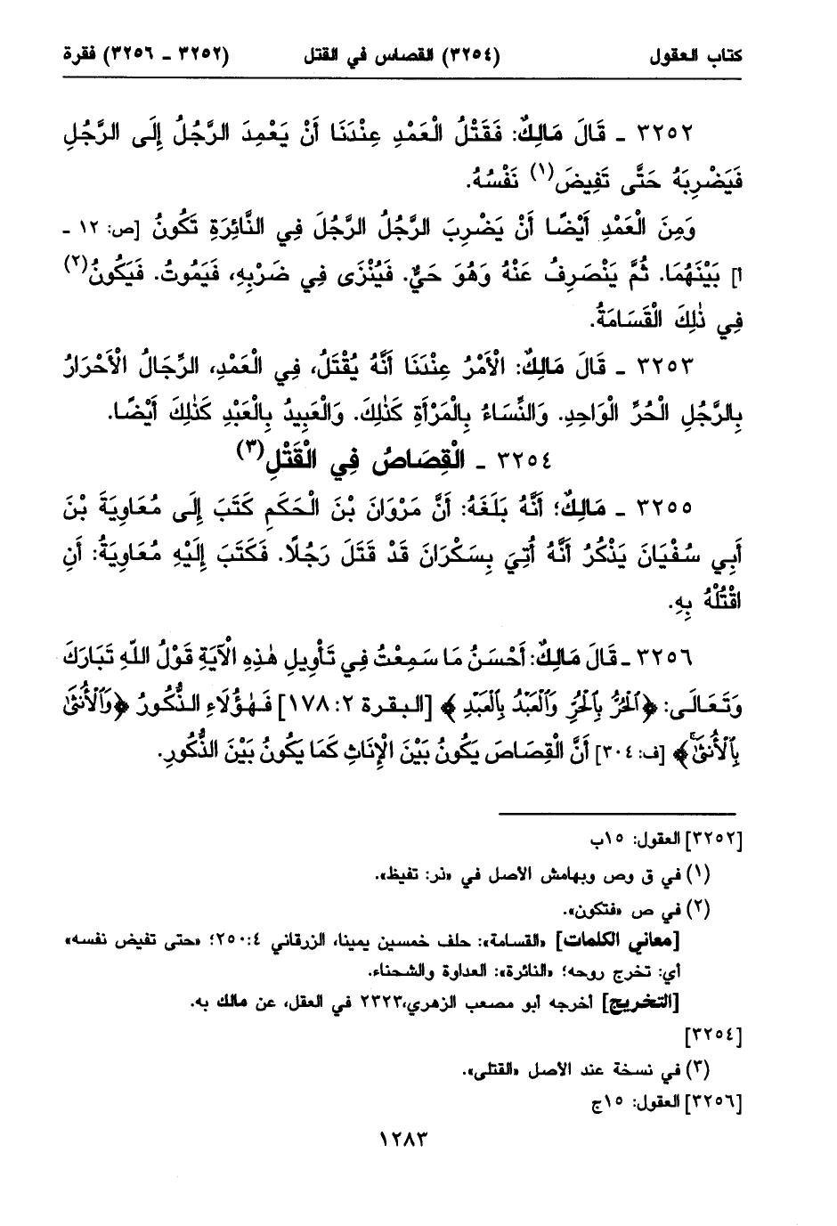 ٣٢٥٦ - قَالَ مَالِكٌ: أَحْسَنُ مَا سَمِعْتُ فِي تَأْوِيلِ هذِهِ الْآيَةِ قَوْلُ اللهِ تَبَارَكَ وَتَعَالَى: {الحُرُّ بِالحُرِّ وَالعَبْدُ بِالعَبْدِ} [البقرة ٢: ١٧٨] فَهؤُلَاءِ الذُّكُورُ {وَالأُنْثَى بِالأُنْثَى} [ف: ٣٠٤] أَنَّ الْقِصَاصَ يَكُونُ بَيْنَ الْإِنَاثِ كَمَا يَكُونُ بَيْنَ الذُّكُورِ. ⦗١٢٨٤⦘