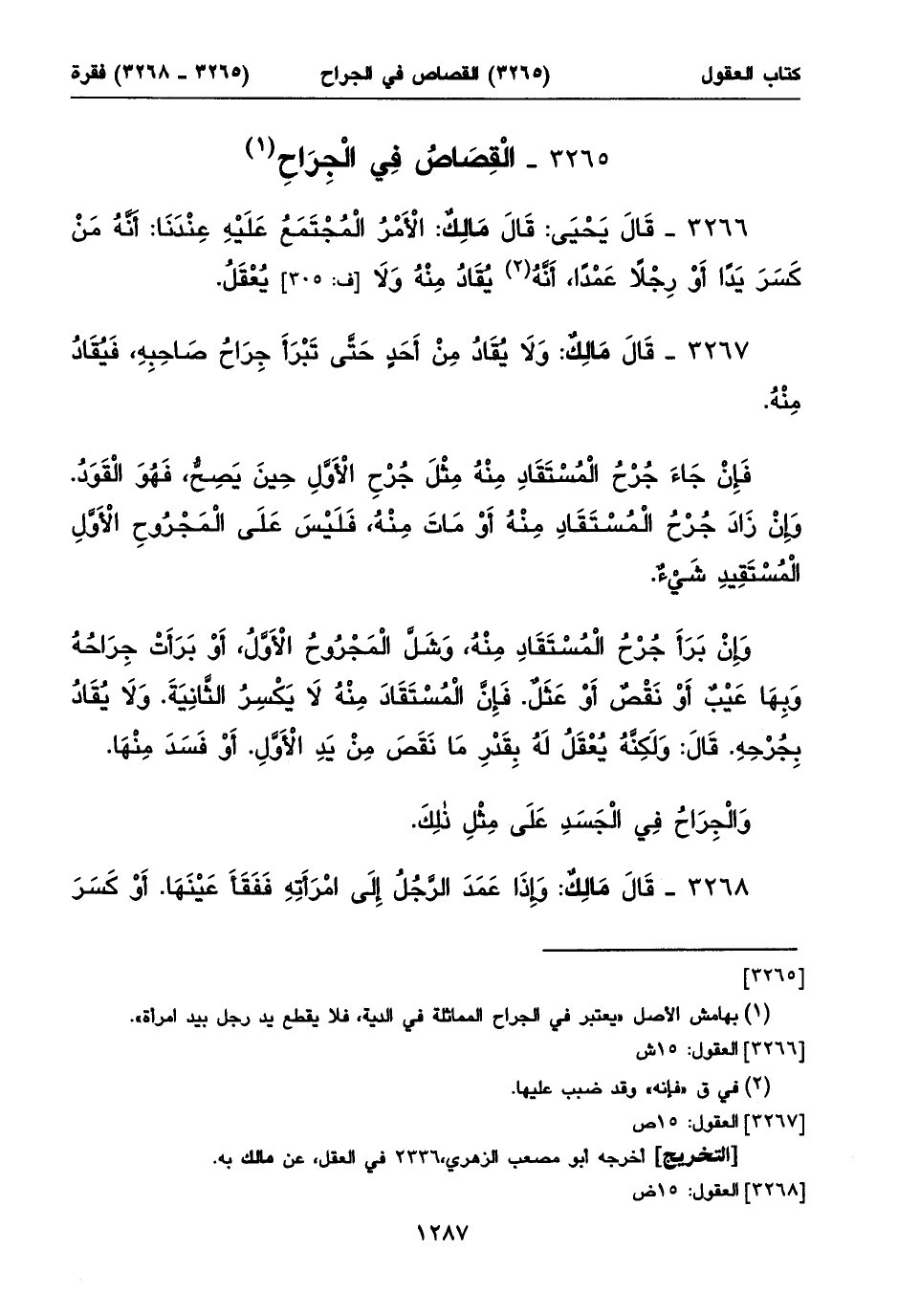 ٣٢٦٦ - قَالَ يَحْيَى: قَالَ مَالِكٌ: الْأَمْرُ الْمُجْتَمَعُ عَلَيْهِ عِنْدَنَا: أَنَّهُ مَنْ كَسَرَ يَداً أَوْ رِجْلاً عَمْداً، أَنَّهُ (١) يُقَادُ مِنْهُ وَلَا [ف: ٣٠٥] يُعْقَلُ.