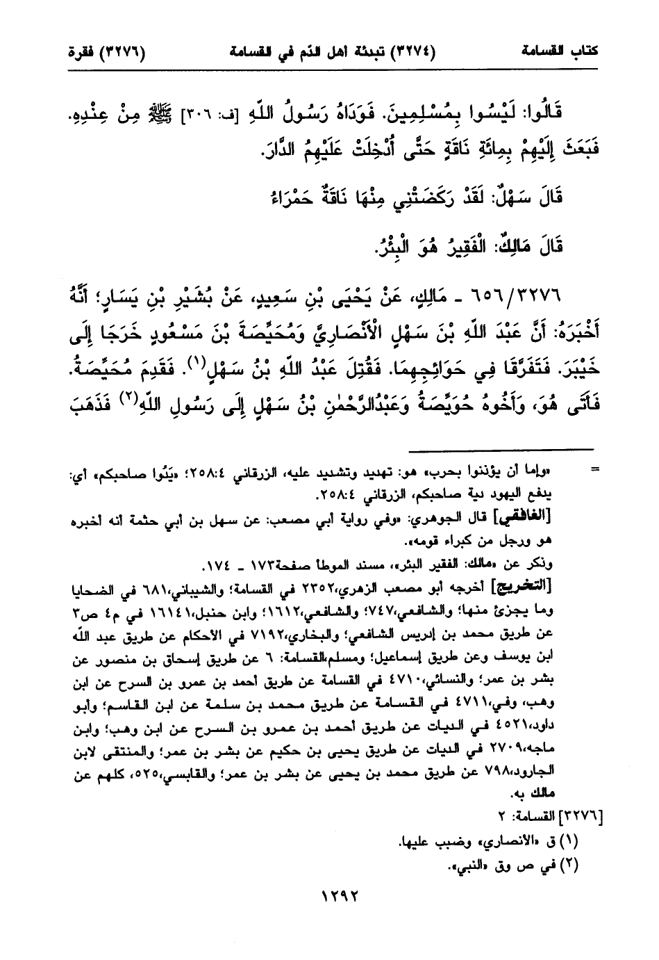 قال الجوهري: «وفي رواية أبي مصعب: وعبد الرحمن بن سهل، وهو أخو المقتول. وفيها: كبّر كبّر. وفيها: ودّاه من عنده، وهذا حديث مرسل»، مسند الموطأ صفحة٢٩٢