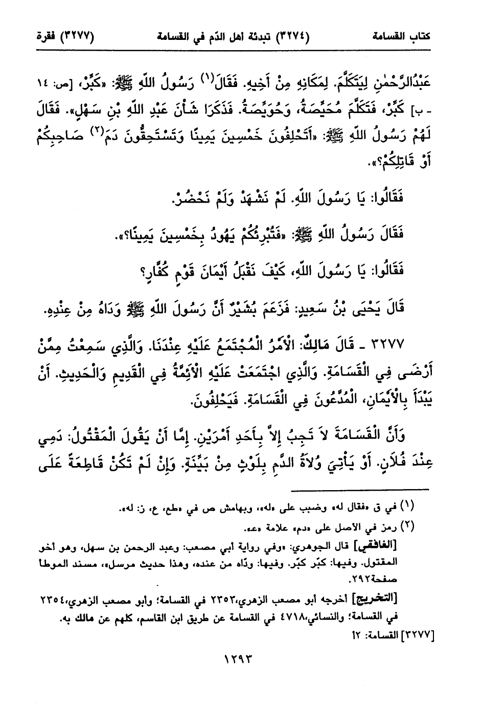 ٣٢٧٧ - قَالَ مَالِكٌ: الْأَمْرُ الْمُجْتَمَعُ عَلَيْهِ عِنْدَنَا. وَالَّذِي سَمِعْتُ مِمَّنْ أَرْضَى فِي الْقَسَامَةِ. وَالَّذِي اجْتَمَعَتْ عَلَيْهِ الْأَئِمَّةُ فِي الْقَدِيمِ وَالْحَدِيثِ. أَنْ يَبْدَأَ بِالْأَيْمَانِ، الْمُدَّعُونَ فِي الْقَسَامَةِ. فَيَحْلِفُونَ.