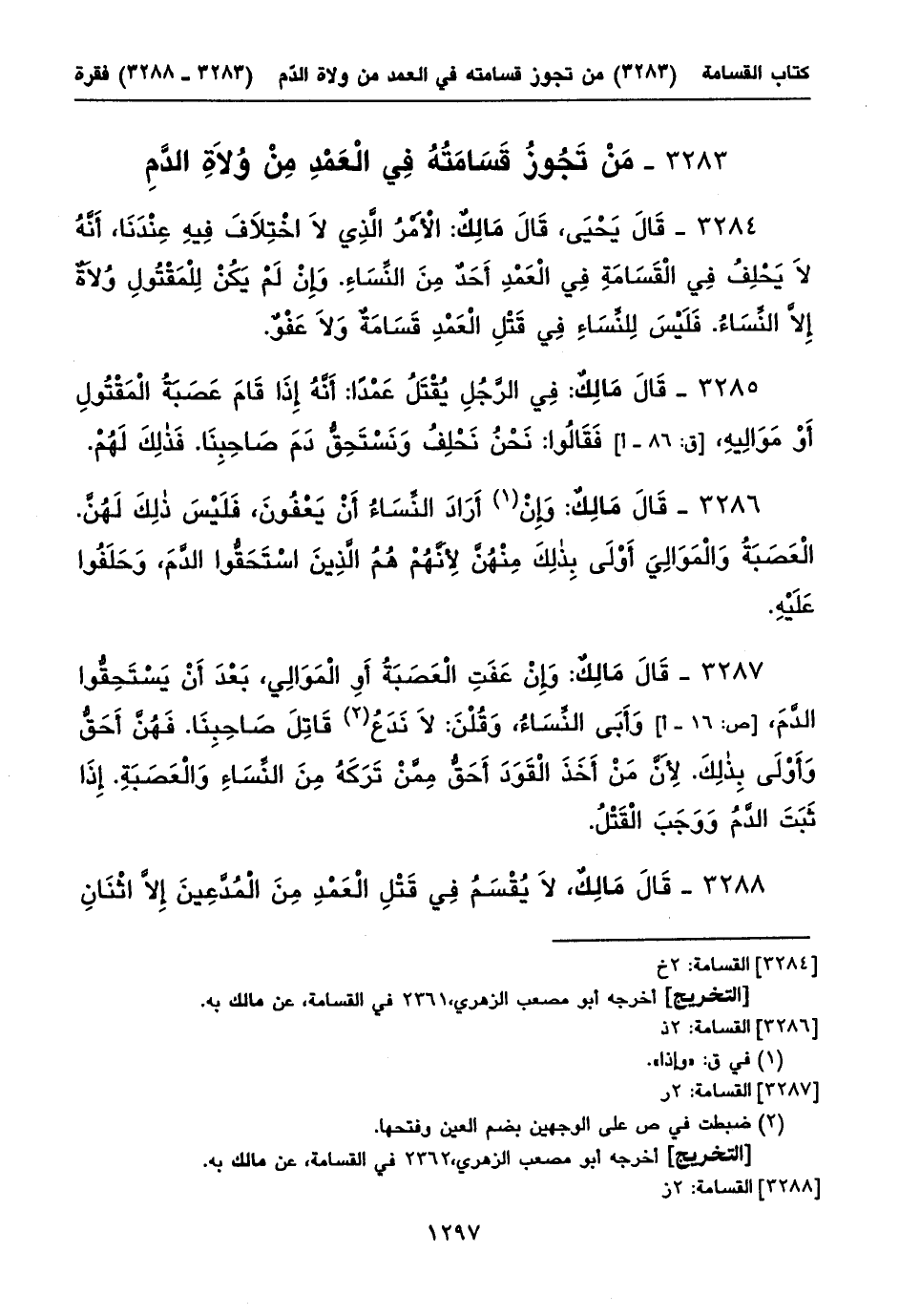 ٣٢٨٨ - قَالَ مَالِكٌ، لَا يُقْسَمُ فِي قَتْلِ الْعَمْدِ مِنَ الْمُدَّعِينَ إِلَاّ اثْنَانِ ⦗١٢٩٨⦘ فَصَاعِداً. تُرَدَّدُ الْأَيْمَانُ عَلَيْهِمَا حَتَّى يَحْلِفَا خَمْسِينَ يَمِيناً، ثُمَّ قَدِ اسْتَحَقَّا (١) الدَّمَ. وَذلِكَ الْأَمْرُ عِنْدَنَا.