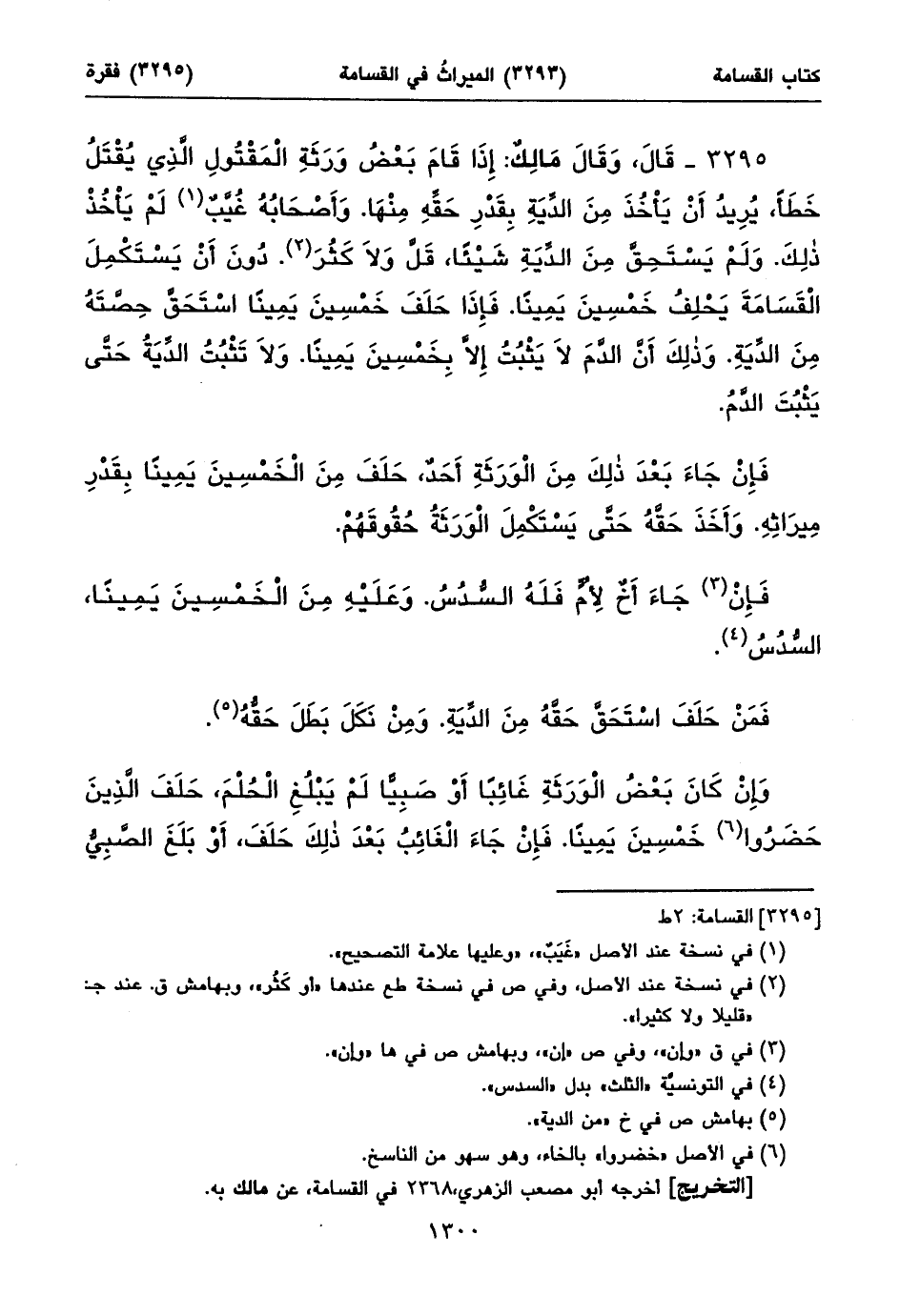 ٣٢٩٥ - قَالَ، وَقَالَ مَالِكٌ: إِذَا قَامَ بَعْضُ وَرَثَةِ الْمَقْتُولِ الَّذِي يُقْتَلُ خَطَأً، يُرِيدُ أَنْ يَأْخُذَ مِنَ الدِّيَةِ بِقَدْرِ حَقِّهِ مِنْهَا. وَأَصْحَابُهُ غُيَّبٌ (١) لَمْ يَأْخُذْ ذلِكَ. وَلَمْ يَسْتَحِقَّ مِنَ الدِّيَةِ شَيْئاً، قَلَّ وَلَا كَثُرَ (٢). دُونَ أَنْ يَسْتَكْمِلَ الْقَسَامَةَ يَحْلِفُ خَمْسِينَ يَمِيناً. فَإِذَا حَلَفَ خَمْسِينَ يَمِيناً اسْتَحَقَّ حِصَّتَهُ مِنَ الدِّيَةِ. وَذلِكَ أَنَّ الدَّمَ لَا يَثْبُتُ إِلَاّ بِخَمْسِينَ يَمِيناً. وَلَا تَثْبُتُ الدِّيَةُ حَتَّى يَثْبُتَ الدَّمُ.