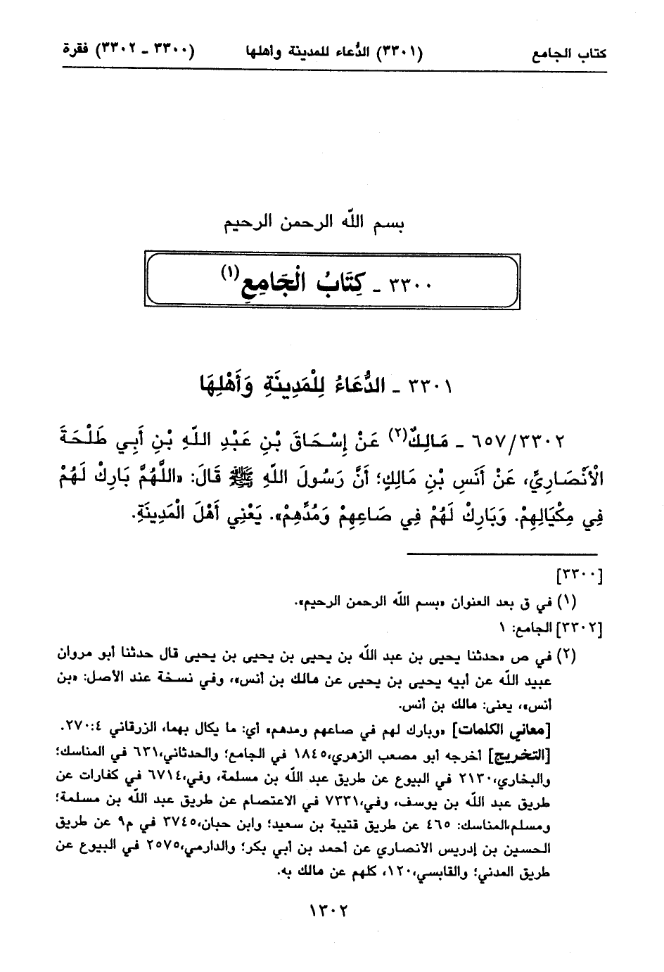 ٣٣٠٢/ ٦٥٧ - مَالِكٌ (١) عَنْ إِسْحَاقَ بْنِ عَبْدِ اللهِ بْنِ أَبِي طَلْحَةَ الْأَنْصَارِيِّ، عَنْ أَنَسِ بْنِ مَالِكٍ؛ أَنَّ رَسُولَ اللهِ صلى الله عليه وسلم قَالَ: «اللَّهُمَّ بَارِكْ لَهُمْ فِي مِكْيَالِهِمْ. وَبَارِكْ لَهُمْ فِي صَاعِهِمْ وَمُدِّهِمْ». يَعْنِي أَهْلَ الْمَدِينَةِ.