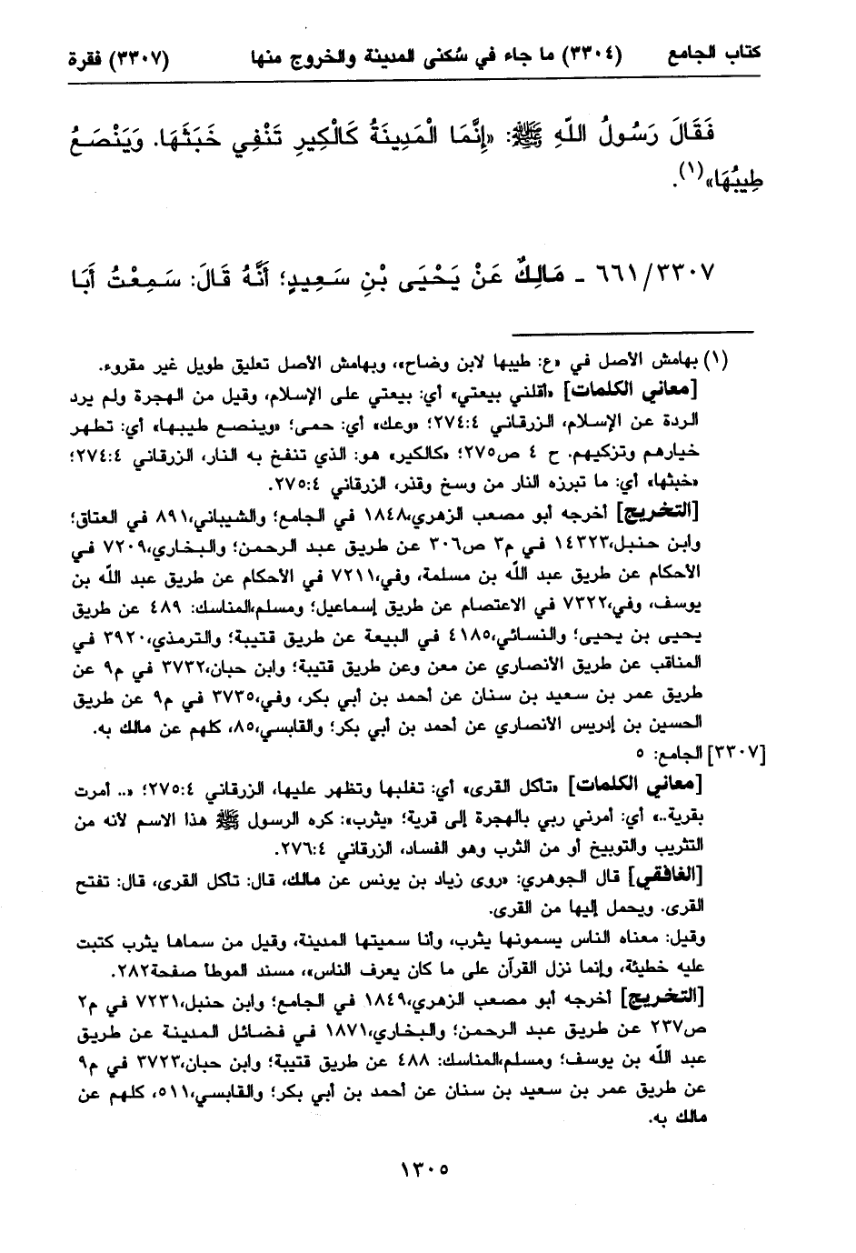 أخرجه أبو مصعب الزهري، ١٨٤٩ في الجامع؛ وابن حنبل، ٧٢٣١ في م٢ ص٢٣٧ عن طريق عبد الرحمن؛ والبخاري، ١٨٧١ في فضائل المدينة عن طريق عبد اللهبن يوسف؛ ومسلم، المناسك: ٤٨٨ عن طريق قتيبة؛ وابن حبان، ٣٧٢٣ في م٩ عن طريق عمر بن سعيد بن سنان عن أحمد بن أبي بكر؛ والقابسي، ٥١١، كلهم عن مالك به.