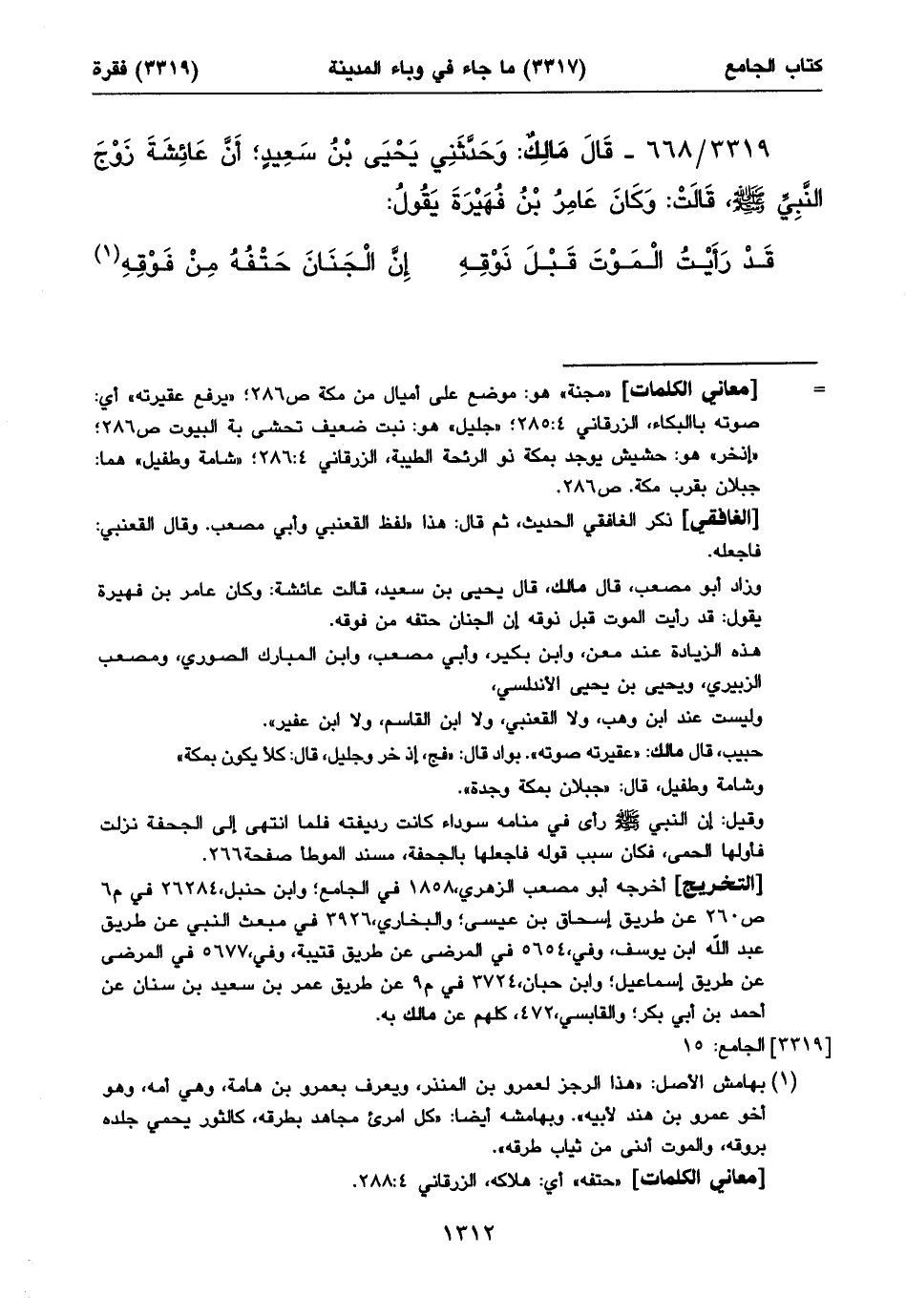 ٣٣١٩/ ٦٦٨ - قَالَ مَالِكٌ: وَحَدَّثَنِي يَحْيَى بْنُ سَعِيدٍ؛ أَنَّ عَائِشَةَ زَوْجَ النَّبِيِّ صلى الله عليه وسلم، قَالَتْ: وَكَانَ عَامِرُ بْنُ فُهَيْرَةَ يَقُولُ: