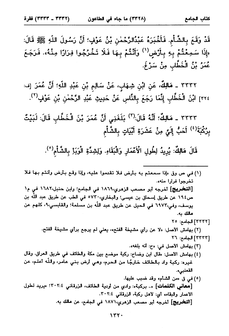 ٣٣٣٢ - مَالِكٌ، عَنِ ابْنِ شِهَابٍ، عَنْ سَالِمِ بْنِ عَبْدِ اللهِ؛ أَنَّ عُمَرَ [ف: ٣٢٤] ابْنَ الْخَطَّابِ إِنَّمَا رَجَعَ بِالنَّاسِ عَنْ حَدِيثِ عَبْدِ الرَّحْمنِ بْنِ عَوْفٍ (١).