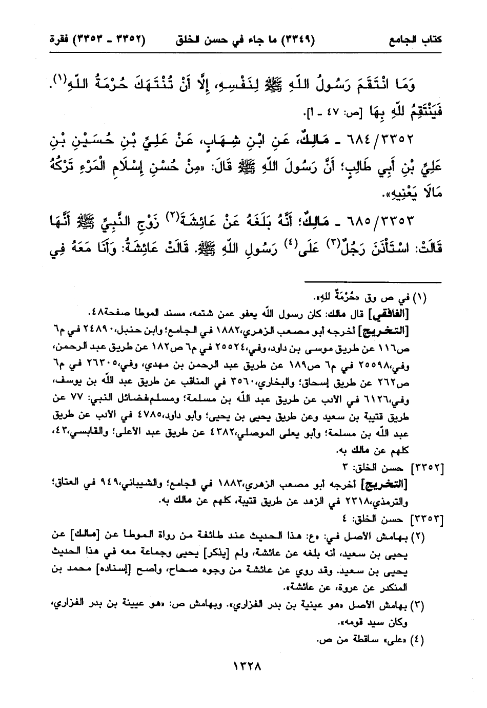 ٣٣٥٢/ ٦٨٤ - مَالِكٌ، عَنِ ابْنِ شِهَابٍ، عَنْ عَلِيِّ بْنِ حُسَيْنِ بْنِ عَلِيِّ بْنِ أَبِي طَالِبٍ؛ أَنَّ رَسُولَ اللهِ صلى الله عليه وسلم قَالَ: «مِنْ حُسْنِ إِسْلَامِ الْمَرْءِ تَرْكُهُ مَالَا يَعْنِيهِ».