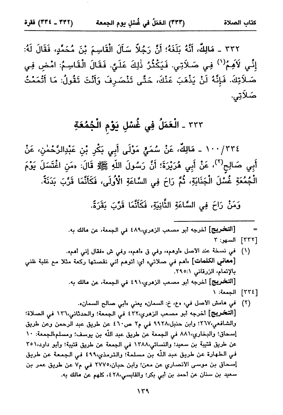 ٣٣٤/ ١٠٠ - مَالِكٌ، عَنْ سُمَيٍّ مَوْلَى أَبِي بَكْرِ بْنِ عَبْدِ الرَّحْمنِ، عَنْ أَبِي صَالِحٍ (١)، عَنْ أَبِي هُرَيْرَةَ؛ أَنَّ رَسُولَ اللهِ صلى الله عليه وسلم قَالَ: «مَنِ اغْتَسَلَ يَوْمَ الْجُمُعَةِ غُسْلَ الْجَنَابَةِ، ثُمَّ رَاحَ فِي السَّاعَةِ الْأُولَى، فَكَأَنَّمَا قَرَّبَ بَدَنَةً.