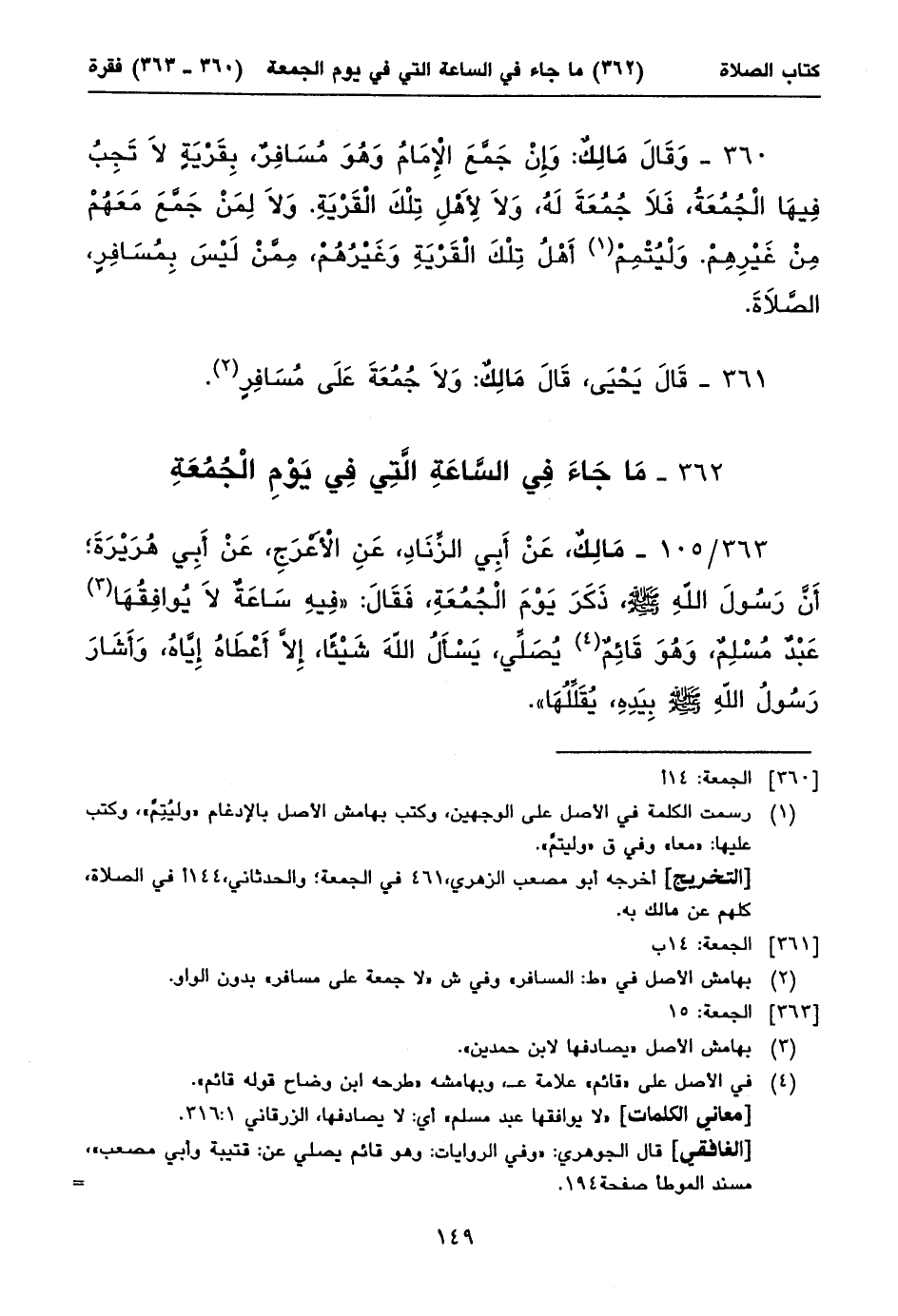 ٣٦١ - قَالَ يَحْيَى، قَالَ مَالِكٌ: وَلَا جُمُعَةَ عَلَى مُسَافِرٍ (١).