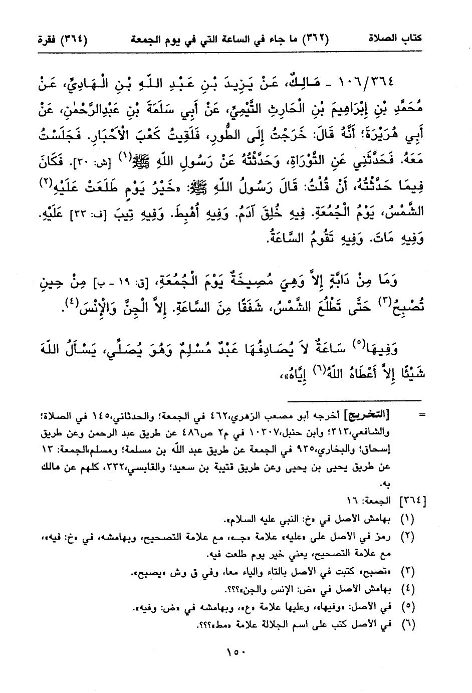 ٣٦٤/ ١٠٦ - مَالِكٌ، عَنْ يَزِيدَ بْنِ عَبْدِ اللهِ بْنِ الْهَادِيِّ، عَنْ مُحَمَّدِ بْنِ إِبْرَاهِيمَ بْنِ الْحَارِثِ التَّيْمِيِّ، عَنْ أَبِي سَلَمَةَ بْنِ عَبْدِ الرَّحْمنِ، عَنْ أَبِي هُرَيْرَةَ؛ أَنَّهُ قَالَ: خَرَجْتُ إِلَى الطُّورِ، فَلَقِيتُ كَعْبَ الْأَحْبَارِ. فَجَلَسْتُ مَعَهُ. فَحَدَّثَنِي عَنِ التَّوْرَاةِ، وَحَدَّثْتُهُ عَنْ رَسُولِ اللهِ صلى الله عليه وسلم (١) [ش: ٣٠]. فَكَانَ فِيمَا حَدَّثْتُهُ، أَنْ قُلْتُ: قَالَ رَسُولُ اللهِ صلى الله عليه وسلم: «خَيْرُ يَوْمٍ طَلَعَتْ عَلَيْهِ (٢) الشَّمْسُ، يَوْمُ الْجُمُعَةِ. فِيهِ خُلِقَ آدَمُ. وَفِيهِ أُهْبِطَ. وَفِيهِ تِيبَ [ف: ٣٣] عَلَيْهِ. وَفِيهِ مَاتَ. وَفِيهِ تَقُومُ السَّاعَةُ.