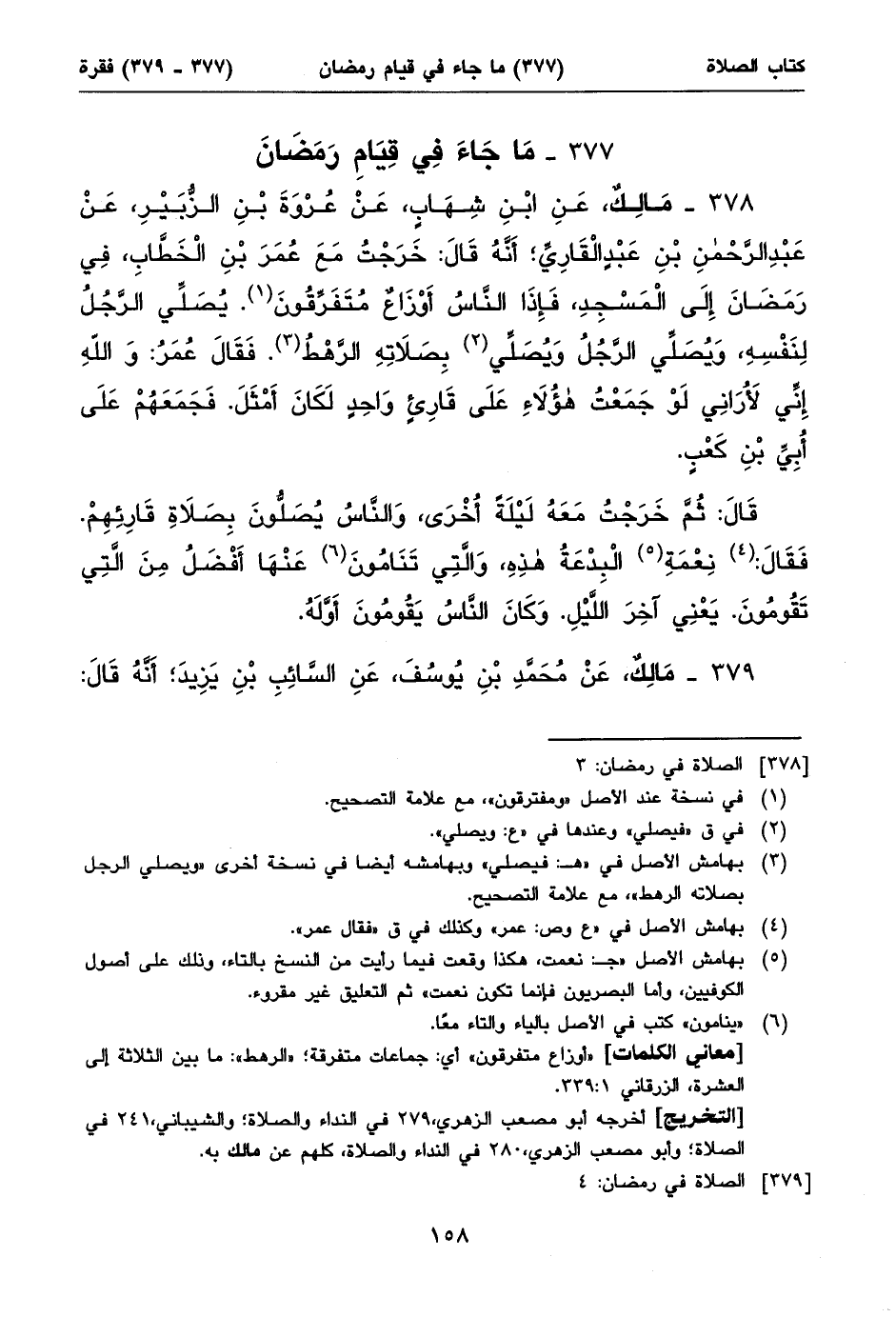 ٣٧٨ - مَالِكٌ، عَنِ ابْنِ شِهَابٍ، عَنْ عُرْوَةَ بْنِ الزُّبَيْرِ، عَنْ عَبْدِ الرَّحْمنِ بْنِ عَبْدٍ الْقَارِيِّ؛ أَنَّهُ قَالَ: خَرَجْتُ مَعَ عُمَرَ بْنِ الْخَطَّابِ، فِي رَمَضَانَ إِلَى الْمَسْجِدِ، فَإِذَا النَّاسُ أَوْزَاعٌ مُتَفَرِّقُونَ (١). يُصَلِّي الرَّجُلُ لِنَفْسِهِ، وَيُصَلِّي الرَّجُلُ وَيُصَلِّي (٢) بِصَلَاتِهِ الرَّهْطُ (٣). فَقَالَ عُمَرُ: وَاللهِ إِنِّي لأُرَانِي لَوْ جَمَعْتُ هؤُلَاءِ عَلَى قَارِئٍ وَاحِدٍ لَكَانَ أَمْثَلَ. فَجَمَعَهُمْ عَلَى أُبِيِّ بْنِ كَعْبٍ.