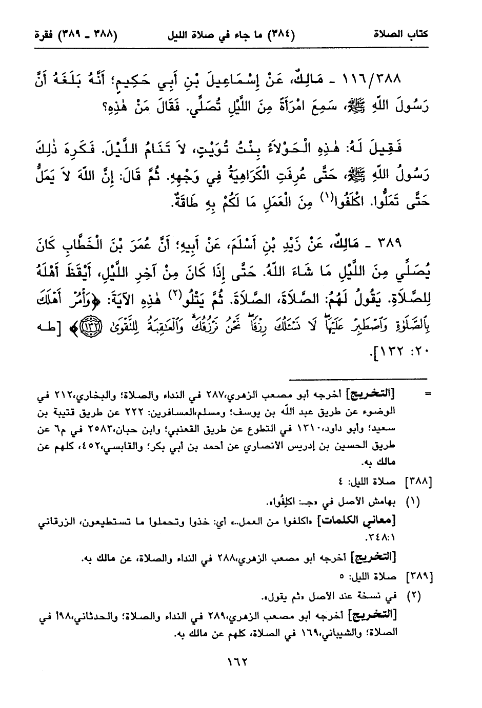 ٣٨٩ - مَالِكٌ، عَنْ زَيْدِ بْنِ أَسْلَمَ، عَنْ أَبِيهِ؛ أَنَّ عُمَرَ بْنَ الْخَطَّابِ كَانَ يُصَلِّي مِنَ اللَّيْلِ مَا شَاءَ اللهُ. حَتَّى إِذَا كَانَ مِنْ آخِرِ اللَّيْلِ، أَيْقَظَ أَهْلَهُ لِلصَّلَاةِ. يَقُولُ لَهُمُ: الصَّلَاةَ، الصَّلَاةَ. ثُمَّ يَتْلُو (١) هذِهِ الآيَةَ: {وَأْمُرْ أَهْلَكَ بِالصَّلَوةِ وَاِصْطَبِرْ عَلَيْهَا لا نَسئَلُكَ رِزْقاً نَحْنُ نَرْزُقُكَ وَالعَاقِبَةُ لِلتَّقْوَى} [طه ٢٠: ١٣٢].