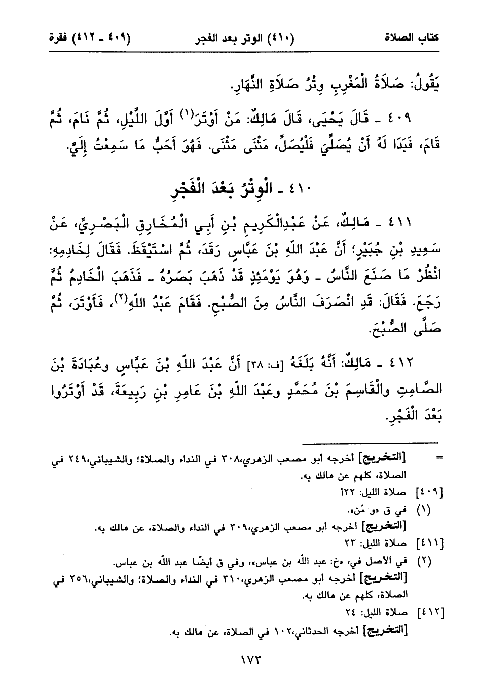٤١١ - مَالِكٌ، عَنْ عَبْدِ الْكَرِيمِ بْنِ أَبِي الْمُخَارِقِ الْبَصْرِيِّ، عَنْ سَعِيدِ بْنِ جُبَيْرٍ؛ أَنَّ عَبْدَ اللهِ بْنَ عَبَّاسٍ رَقَدَ، ثُمَّ اسْتَيْقَظَ. فَقَالَ لِخَادِمِهِ: انْظُرْ مَا صَنَعَ النَّاسُ - وَهُوَ يَوْمَئِذٍ قَدْ ذَهَبَ بَصَرُهُ - فَذَهَبَ الْخَادِمُ ثُمَّ رَجَعَ. فَقَالَ: قَدِ انْصَرَفَ النَّاسُ مِنَ الصُّبْحِ. فَقَامَ عَبْدُ اللهِ (١)، فَأَوْتَرَ،