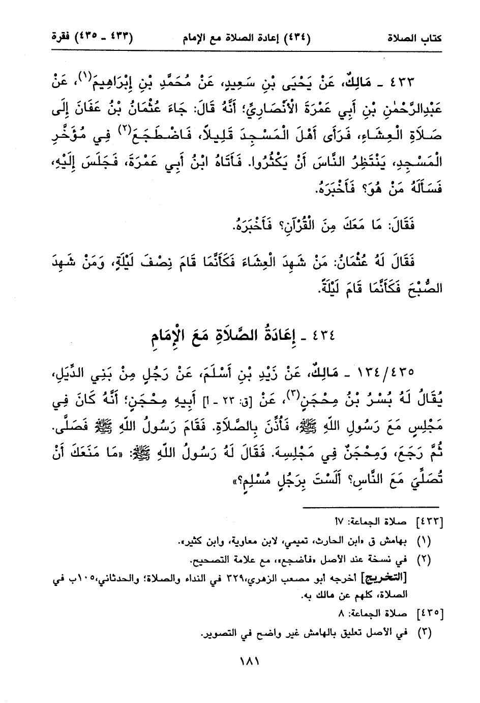 ٤٣٥/ ١٣٤ - مَالِكٌ، عَنْ زَيْدِ بْنِ أَسْلَمَ، عَنْ رَجُلٍ مِنْ بَنِي الدِّيَلِ، يُقَالُ لَهُ بُسْرُ بْنُ مِحْجَنٍ (١)، عَنْ [ق: ٢٣ - أ] أَبِيهِ مِحْجَنٍ؛ أَنَّهُ كَانَ فِي مَجْلِسٍ مَعَ رَسُولِ اللهِ صلى الله عليه وسلم، فَأُذِّنَ بِالصَّلَاةِ. فَقَامَ رَسُولُ اللهِ صلى الله عليه وسلم فَصَلَّى. ثُمَّ رَجَعَ، وَمِحْجَنٌ فِي مَجْلِسِهَ. فَقَالَ لَهُ رَسُولُ اللهِ صلى الله عليه وسلم: «مَا مَنَعَكَ أَنْ تُصَلِّيَ مَعَ النَّاسِ؟ أَلَسْتَ بِرَجُلٍ مُسْلِمٍ؟» ⦗١٨٢⦘