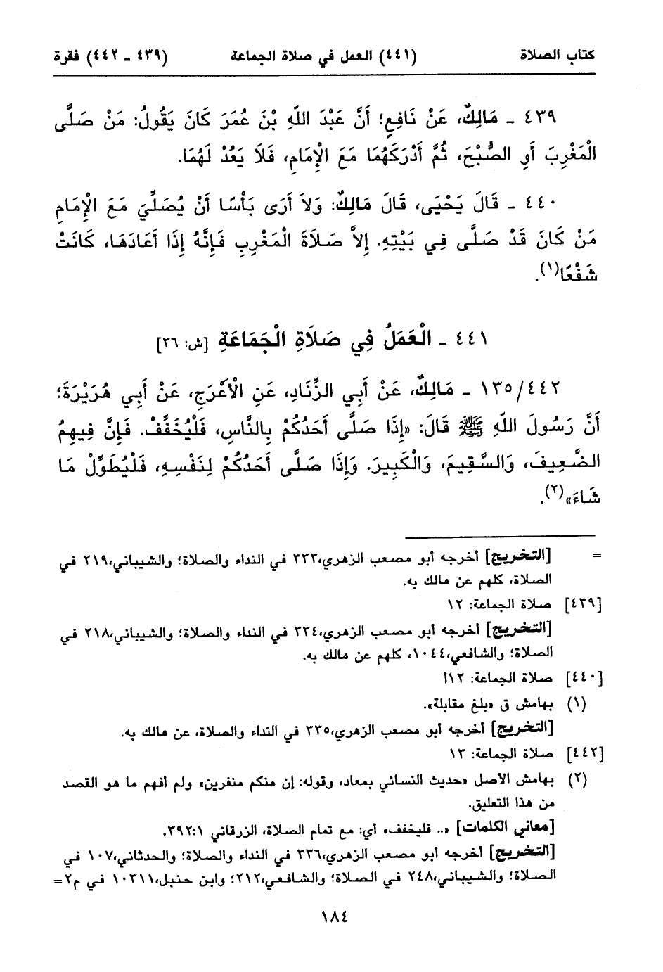 ٤٤٢/ ١٣٥ - مَالِكٌ، عَنْ أَبِي الزِّنَادِ، عَنِ الْأَعْرَجِ، عَنْ أَبِي هُرَيْرَةَ؛ أَنَّ رَسُولَ اللهِ صلى الله عليه وسلم قَالَ: «إِذَا صَلَّى أَحَدُكُمْ بِالنَّاسِ، فَلْيُخَفِّفْ. فَإِنَّ فِيهِمُ الضَّعِيفَ، وَالسَّقِيمَ، وَالْكَبِيرَ. وَإِذَا صَلَّى أَحَدُكُمْ لِنَفْسِهِ، فَلْيُطَوِّلْ مَا شَاءَ» (١).