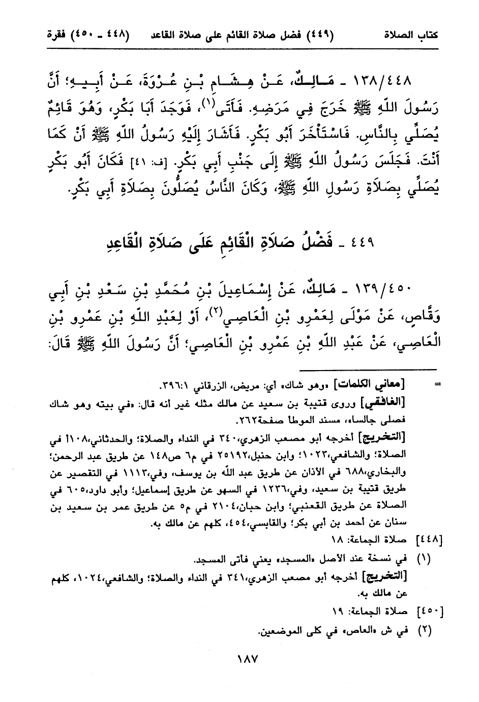 ٤٤٨/ ١٣٨ - مَالِكٌ، عَنْ هِشَامِ بْنِ عُرْوَةَ، عَنْ أَبِيهِ؛ أَنَّ رَسُولَ اللهِ صلى الله عليه وسلم خَرَجَ فِي مَرَضِهِ. فَأَتَى (١)، فَوَجَدَ أَبَا بَكْرٍ، وَهُوَ قَائِمٌ يُصَلِّي بِالنَّاسِ. فَاسْتَأْخَرَ أَبُو بَكْرٍ. فَأَشَارَ إِلَيْهِ رَسُولُ اللهِ صلى الله عليه وسلم أَنْ كَمَا أَنْتَ. فَجَلَسَ رَسُولُ اللهِ صلى الله عليه وسلم إِلَى جَنْبِ أَبِي بَكْرٍ. [ف: ٤١] فَكَانَ أَبُو بَكْرٍ يُصَلِّي بِصَلَاةِ رَسُولِ اللهِ صلى الله عليه وسلم، وَكَانَ النَّاسُ يُصَلُّونَ بِصَلَاةِ أَبِي بَكْرٍ.