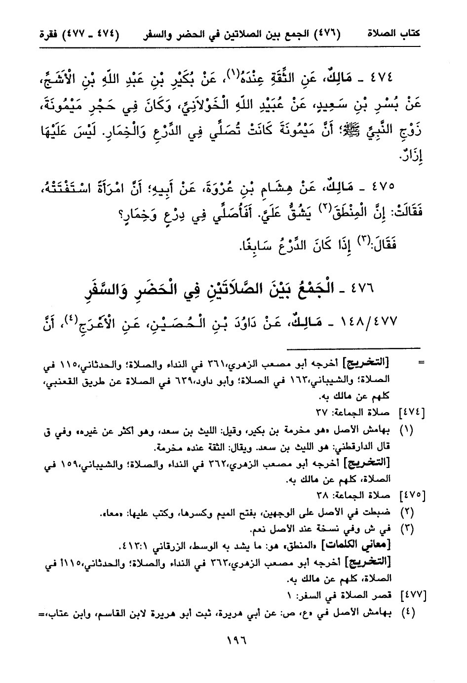 ٤٧٧/ ١٤٨ - مَالِكٌ، عَنْ دَاوُدَ بْنِ الْحُصَيْنِ، عَنِ الْأَعْرَجِ (١)، أَنَّ ⦗١٩٧⦘ رَسُولَ اللهِ صلى الله عليه وسلم كَانَ يَجْمَعُ بَيْنَ الظُّهْرِ وَالْعَصْرِ، فِي سَفَرِهِ إِلَى تَبُوكَ.