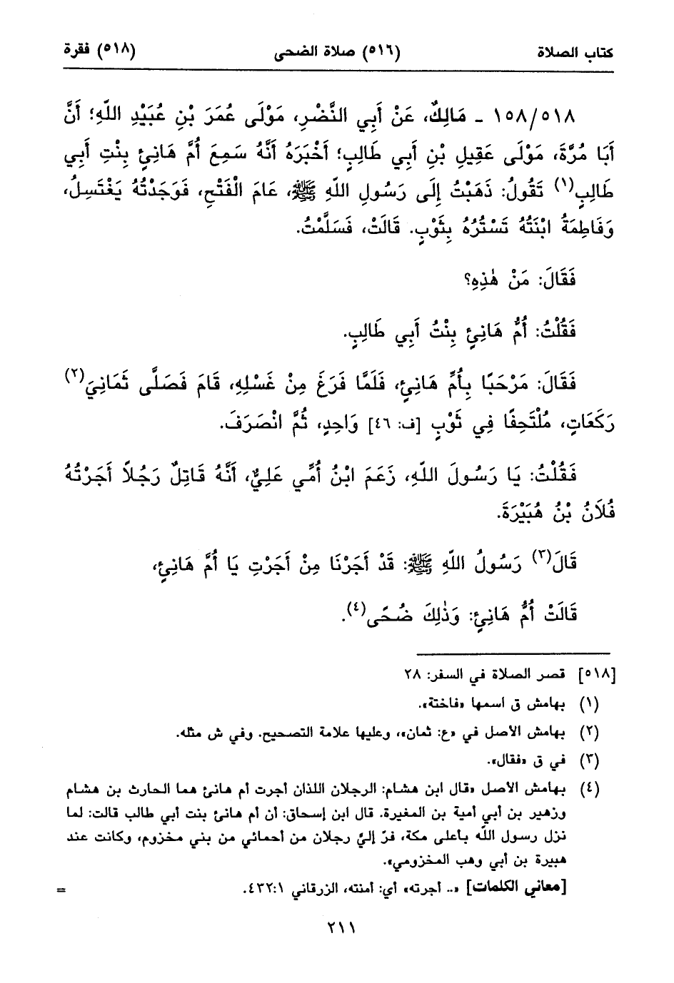 ٥١٨/ ١٥٨ - مَالِكٌ، عَنْ أَبِي النَّضْرِ، مَوْلَى عُمَرَ بْنِ عُبَيْدِ اللهِ؛ أَنَّ أَبَا مُرَّةَ، مَوْلَى عَقِيلِ بْنِ أَبِي طَالِبٍ؛ أَخْبَرَهُ أَنَّهُ سَمِعَ أُمَّ هَانِئٍ بِنْتِ أَبِي طَالِبٍ (١) تَقُولُ: ذَهَبْتُ إِلَى رَسُولِ اللهِ صلى الله عليه وسلم، عَامَ الْفَتْحِ، فَوَجَدْتُهُ يَغْتَسِلُ، وَفَاطِمَةُ ابْنَتُهُ تَسْتُرُهُ بِثَوْبٍ. قَالَتْ، فَسَلَّمْتُ.