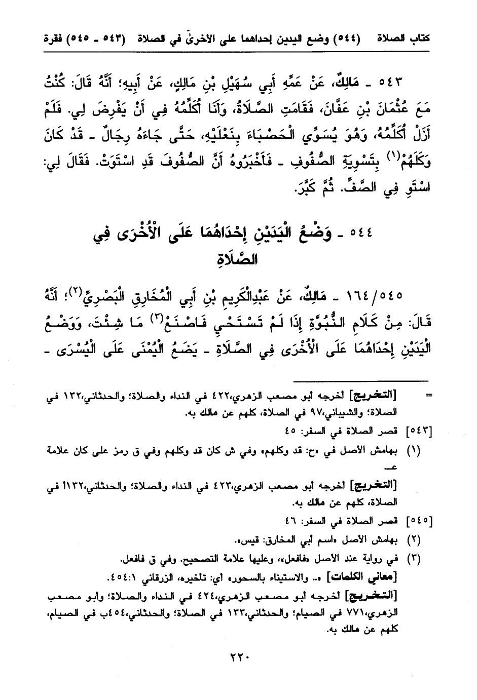 ٥٤٣ - مَالِكٌ، عَنْ عَمِّهِ أَبِي سُهَيْلِ بْنِ مَالِكٍ، عَنْ أَبِيهِ؛ أَنَّهُ قَالَ: كُنْتُ مَعَ عُثْمَانَ بْنِ عَفَّانَ، فَقَامَتِ الصَّلَاةُ، وَأَنَا أُكَلِّمُهُ فِي أَنْ يَفْرِضَ لِي. فَلَمْ أَزَلْ أُكَلِّمُهُ، وَهُوَ يُسَوِّي الْحَصْبَاءَ بِنَعْلَيْهِ، حَتَّى جَاءَهُ رِجَالٌ - قَدْ كَانَ وَكَلَهُمْ (١) بِتَسْوِيَةِ الصُّفُوفِ - فَأَخْبَرُوهُ أَنَّ الصُّفُوفَ قَدِ اسْتَوَتْ. فَقَالَ لِي: اسْتَوِ فِي الصَّفِّ. ثُمَّ كَبَّرَ.