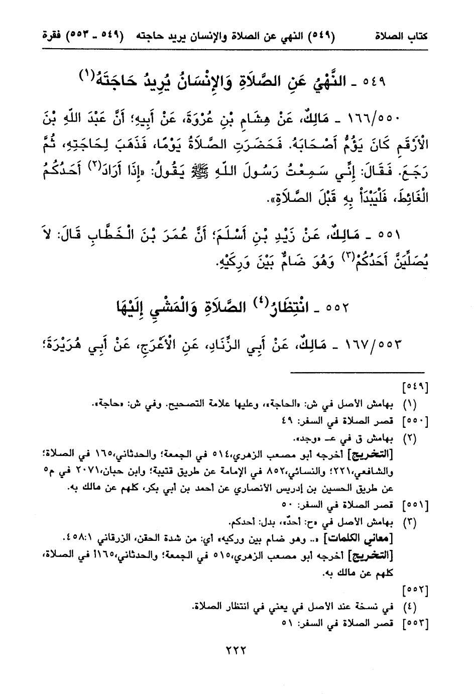 ٥٥٠/ ١٦٦ - مَالِكٌ، عَنْ هِشَامِ بْنِ عُرْوَةَ، عَنْ أَبِيهِ؛ أَنَّ عَبْدَ اللهِ بْنَ الْأَرْقَمِ كَانَ يَؤُمُّ أَصْحَابَهُ. فَحَضَرَتِ الصَّلَاةُ يَوْماً، فَذَهَبَ لِحَاجَتِهِ، ثُمَّ رَجَعَ. فَقَالَ: إِنِّي سَمِعْتُ رَسُولَ اللهِ صلى الله عليه وسلم يَقُولُ: «إِذَا أَرَادَ (١) أَحَدُكُمُ الْغَائِطَ، فَلْيَبْدَأْ بِهِ قَبْلَ الصَّلَاةِ».