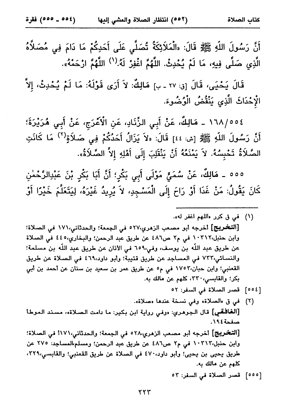 أخرجه أبو مصعب الزهري، ٥٢٨ في الجمعة؛ والحدثاني، ١٧١أفي الصلاة؛ وابن حنبل، ١٠٣١٣ في م٢ ص٤٨٦ عن طريق عبد الرحمن؛ ومسلم، المساجد: ٢٧٥ عن طريق يحيى بن يحيى؛ وأبو داود، ٤٧٠ في الصلاة عن طريق القعنبي؛ والقابسي، ٣٢٩، كلهم عن مالك به.