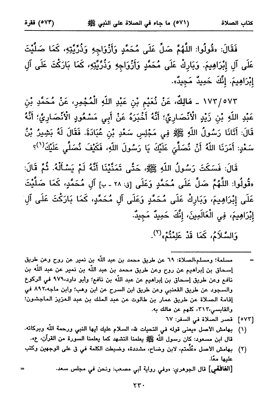 ٥٧٣/ ١٧٣ - مَالِكٌ، عَنْ نُعَيْمِ بْنِ عَبْدِ اللهِ الْمُجْمِرِ، عَنْ مُحَمَّدِ بْنِ عَبْدِ اللهِ بْنِ زَيْدٍ الْأَنْصَارِيِّ؛ أَنَّهُ أَخْبَرَهُ عَنْ أَبِي مَسْعُودٍ الْأَنْصَارِيِّ؛ أَنَّهُ قَالَ: أَتَانَا رَسُولُ اللهِ صلى الله عليه وسلم فِي مَجْلِسِ سَعْدِ بْنِ عُبَادَةَ. فَقَالَ لَهُ بَشِيرُ بْنُ سَعْدٍ: أَمَرَنَا اللهُ أَنْ نُصَلِّيَ عَلَيْكَ يَا رَسُولَ اللهِ، فَكَيْفَ نُصَلِّي عَلَيْكَ (١)؟