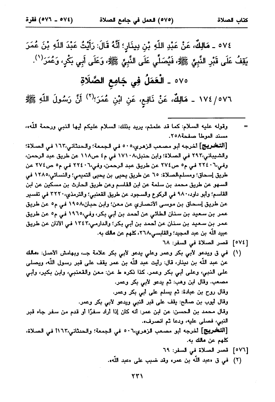 ٥٧٤ - مَالِكٌ، عَنْ عَبْدِ اللهِ بْنِ دِينَارٍ؛ أَنَّهُ قَالَ: رَأَيْتُ عَبْدَ اللهِ بْنَ عُمَرَ يَقِفُ عَلَى قَبْرِ النَّبِيِّ صلى الله عليه وسلم، فَيُصَلِّي عَلَى النَّبِيِّ صلى الله عليه وسلم، وَعَلَى أَبِي بَكْرٍ، وَعُمَرَ (١).