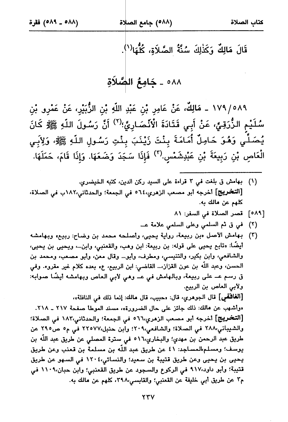 ٥٨٩/ ١٧٩ - مَالِكٌ، عَنْ عَامِرِ بْنِ عَبْدِ اللهِ بْنِ الزُّبَيْرِ، عَنْ عَمْرِو بْنِ سُلَيْمٍ الزُّرَقِيِّ، عَنْ أَبِي قَتَادَةَ الْأَنْصَارِيَّ؛ (١) أَنَّ رَسُولَ اللهِ صلى الله عليه وسلم كَانَ يُصَلِّي وَهُوَ حَامِلٌ أُمَامَةَ بِنْتَ زَيْنَبَ بِنْتِ رَسُولِ اللهِ صلى الله عليه وسلم، وَلِأَبِي الْعَاصِ بْنِ رَبِيعَةَ بْنِ عَبْدِشَمْسٍ. (٢) فَإِذَا سَجَدَ وَضَعَهَا. وَإِذَا قَامَ، حَمَلَهَا.