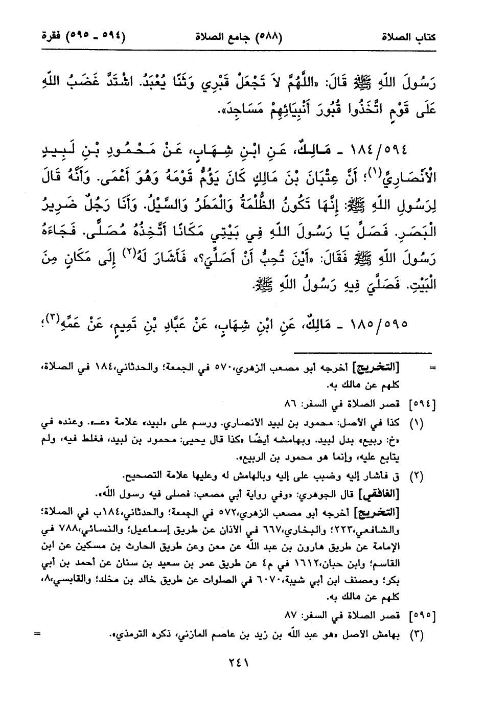 ٥٩٤/ ١٨٤ - مَالِكٌ، عَنِ ابْنِ شِهَابٍ، عَنْ مَحْمُودِ بْنِ لَبِيدٍ الْأَنْصَارِيِّ (١)؛ أَنَّ عِتْبَانَ بْنَ مَالِكٍ كَانَ يَؤُمُّ قَوْمَهُ وَهُوَ أَعْمَى. وَأَنَّهُ قَالَ لِرَسُولِ اللهِ صلى الله عليه وسلم: إِنَّهَا تَكُونُ الظُّلْمَةُ وَالْمَطَرُ وَالسَّيْلُ. وَأَنَا رَجُلٌ ضَرِيرُ الْبَصَرِ. فَصَلِّ يَا رَسُولَ اللهِ فِي بَيْتِي مَكَاناً أَتَّخِذُهُ مُصَلًّى. فَجَاءَهُ رَسُولَ اللهِ صلى الله عليه وسلم فَقَالَ: «أَيْنَ تُحِبُّ أَنْ أَصَلِّيَ؟» فَأَشَارَ لَهُ (٢) إِلَى مَكَانٍ مِنَ الْبَيْتِ. فَصَلَّيَ فِيهِ رَسُولُ اللهِ صلى الله عليه وسلم.