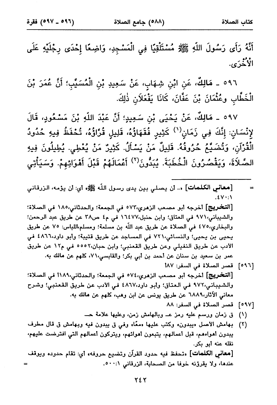٥٩٧ - مَالِكٌ، عَنْ يَحْيَى بْنِ سَعِيدٍ؛ أَنَّ عَبْدَ اللهِ بْنَ مَسْعُودٍ، قَالَ لِإِنْسَانٍ: إِنَّكَ فِي زَمَانٍ (١) كَثِيرٍ فُقَهَاؤُهُ، قَلِيلٍ قُرَّاؤُهُ، تُحْفَظُ فِيهِ حُدُودُ الْقُرْآنِ، وَتُضَيَّعُ حُرُوفُهُ. قَلِيلٌ مَنْ يَسْأَلُ. كَثِيرٌ مَنْ يُعْطِي. يُطِيلُونَ فِيهِ الصَّلَاةَ، وَيَقْصُرُونَ الْخُطَبَةَ. يُبَدُّونَ (٢) أَعْمَالَهُمْ قَبْلَ أَهْوَائِهِمْ. وَسَيَأْتِي ⦗٢٤٣⦘ عَلَىالنَّاسِ زَمَانٌ قَلِيلٌ فُقَهَاؤُهُ، كَثِيرٌ قُرَّاؤُهُ، تُحْفَظُ فِيهِ حُرُوفُ الْقُرْآنِ وَتُضَيَّعُ حُدُودُهُ، كَثِيرٌ مَنْ يَسْأَلُ، قَلِيلٌ مَنْ يُعْطِي. يُطِيلُونَ فِيهِ الْخُطْبَةَ، وَيَقْصُرُونَ الصَّلَاةَ. يُبَدُّونَ فِيهِ أَهْوَاءَهُمْ قَبْلَ أَعْمَالِهِمْ.