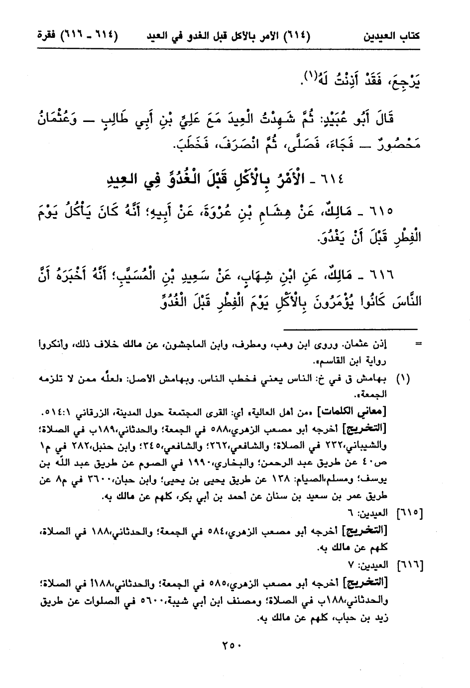 ٦١٦ - مَالِكٌ، عَنِ ابْنِ شِهَابٍ، عَنْ سَعِيدِ بْنِ الْمُسَيَّبِ؛ أَنَّهُ أَخْبَرَهُ أَنَّ النَّاسَ كَانُوا يُؤْمَرُونَ بِالْأَكْلِ يَوْمَ الْفِطْرِ قَبْلَ الْغُدُوِّ ⦗٢٥١⦘