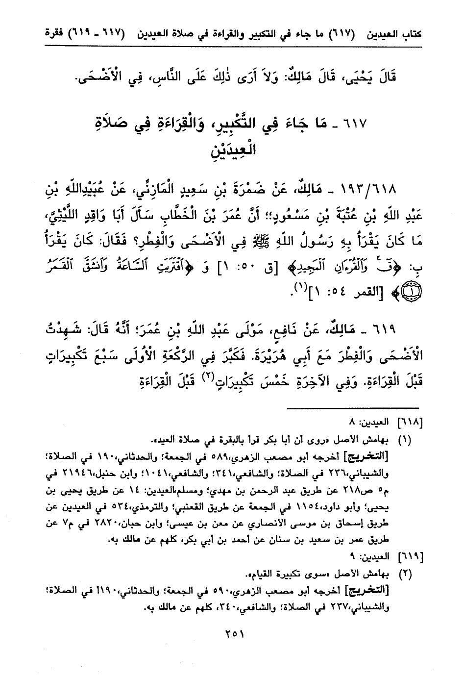 ٦١٩ - مَالِكٌ، عَنْ نَافِعٍ، مَوْلَى عَبْدِ اللهِ بْنِ عُمَرَ؛ أَنَّهُ قَالَ: شَهِدْتُ الْأَضْحَى وَالْفِطْرَ مَعَ أَبِي هُرَيْرَةَ. فَكَبَّرَ فِي الرَّكْعَةِ الْأُولَى سَبْعَ تَكْبِيرَاتٍ قَبْلَ الْقِرَاءَةِ. وَفِي الآخِرَةِ خَمْسَ تَكْبِيرَاتٍ (١) قَبْلَ الْقِرَاءَةِ ⦗٢٥٢⦘