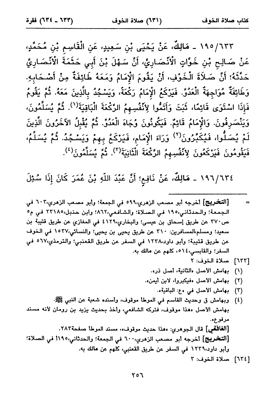 ٦٣٣/ ١٩٥ - مَالِكٌ، عَنْ يَحْيَى بْنِ سَعِيدٍ، عَنِ الْقَاسِمِ بْنِ مُحَمَّدٍ، عَنْ صَالِحِ بْنِ خَوَّاتٍ الْأَنْصَارِيِّ، أَنَّ سَهْلَ بْنَ أَبِي حَثَمَةَ الْأَنْصَارِيَّ حَدَّثَهُ؛ أَنَّ صَلَاةَ الْخَوْفِ، أَنْ يَقُومَ الْإِمَامُ وَمَعَهُ طَائِفَةٌ مِنْ أَصْحَابِهِ. وَطَائِفَةٌ مُوَاجِهَةٌ الْعَدُوَّ. فَيَرْكَعُ الْإِمَامُ رَكْعَةً، وَيَسْجُدُ بِالَّذِينَ مَعَهُ. ثُمَّ يَقُومُ فَإِذَا اسْتَوَى قَائِماً، ثَبَتَ وَأَتَمُّوا لِأَنْفُسِهِمُ الرَّكْعَةَ الْبَاقِيَةَ (١). ثُمَّ يُسَلِّمُونَ، وَيَنْصَرِفُونَ. وَالْإِمَامُ قَائِمٌ. فَيَكُونُونَ وُجَاهَ الْعَدُوِّ. ثُمَّ يُقْبِلُ الآخَرُونَ الَّذِينَ لَمْ يُصَلُّوا، فَيُكَبِّرُونَ (٢) وَرَاءَ الْإِمَامِ، فَيَرْكَعُ بِهِمْ وَيَسْجُدُ. ثُمَّ يُسَلِّمُ، فَيَقُومُونَ فَيَرْكَعُونَ لِأَنْفُسِهِمُ الرَّكْعَةَ الْثَانِيَةَ (٣). ثُمَّ يُسَلِّمُونَ (٤).