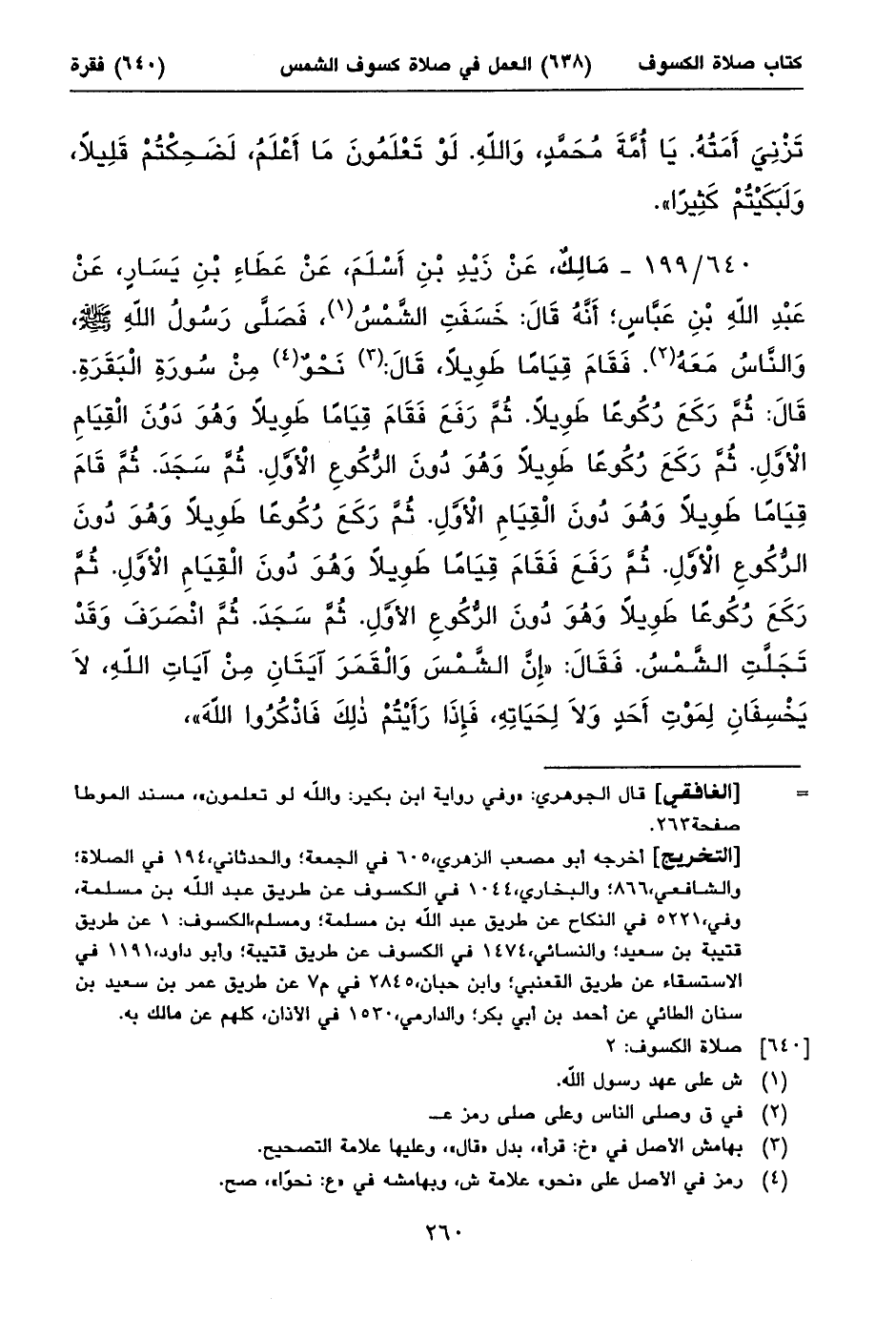 ٦٤٠/ ١٩٩ - مَالِكٌ، عَنْ زَيْدِ بْنِ أَسْلَمَ، عَنْ عَطَاءِ بْنِ يَسَارٍ، عَنْ عَبْدِ اللهِ بْنِ عَبَّاسٍ؛ أَنَّهُ قَالَ: خَسَفَتِ الشَّمْسُ (١)، فَصَلَّى رَسُولُ اللهِ صلى الله عليه وسلم، وَالنَّاسُ مَعَهُ (٢). فَقَامَ قِيَاماً طَوِيلاً، قَالَ: (٣) نَحْوٌ (٤) مِنْ سُورَةِ الْبَقَرَةِ. قَالَ: ثُمَّ رَكَعَ رُكُوعاً طَوِيلاً. ثُمَّ رَفَعَ فَقَامَ قِيَاماً طَوِيلاً وَهُوَ دَوُنَ الْقِيَامِ الْأَوَّلِ. ثُمَّ رَكَعَ رُكُوعاً طَوِيلاً وَهُوَ دُونَ الرُّكُوعِ الْأَوَّلِ. ثُمَّ سَجَدَ. ثُمَّ قَامَ قِيَاماً طَوِيلاً وَهُوَ دُونَ الْقِيَامِ الْأَوَّلِ. ثُمَّ رَكَعَ رُكُوعاً طَوِيلاً وَهُوَ دُونَ الرُّكُوعِ الْأَوَّلِ. ثُمَّ رَفَعَ فَقَامَ قِيَاماً طَوِيلاً وَهُوَ دُونَ الْقِيَامِ الْأَوَّلِ. ثُمَّ رَكَعَ رُكُوعاً طَوِيلاً وَهُوَ دُونَ الرُّكُوعِ الأَوَّلِ. ثُمَّ سَجَدَ. ثُمَّ انْصَرَفَ وَقَدْ تَجَلَّتِ الشَّمْسُ. فَقَالَ: «إِنَّ الشَّمْسَ وَالْقَمَرَ آيَتَانِ مِنْ آيَاتِ اللهِ، لَا يَخْسِفَانِ لِمَوْتِ أَحَدٍ وَلَا لِحَيَاتِهِ، فَإِذَا رَأَيْتُمْ ذلِكَ فَاذْكُرُوا اللهَ»، ⦗٢٦١⦘