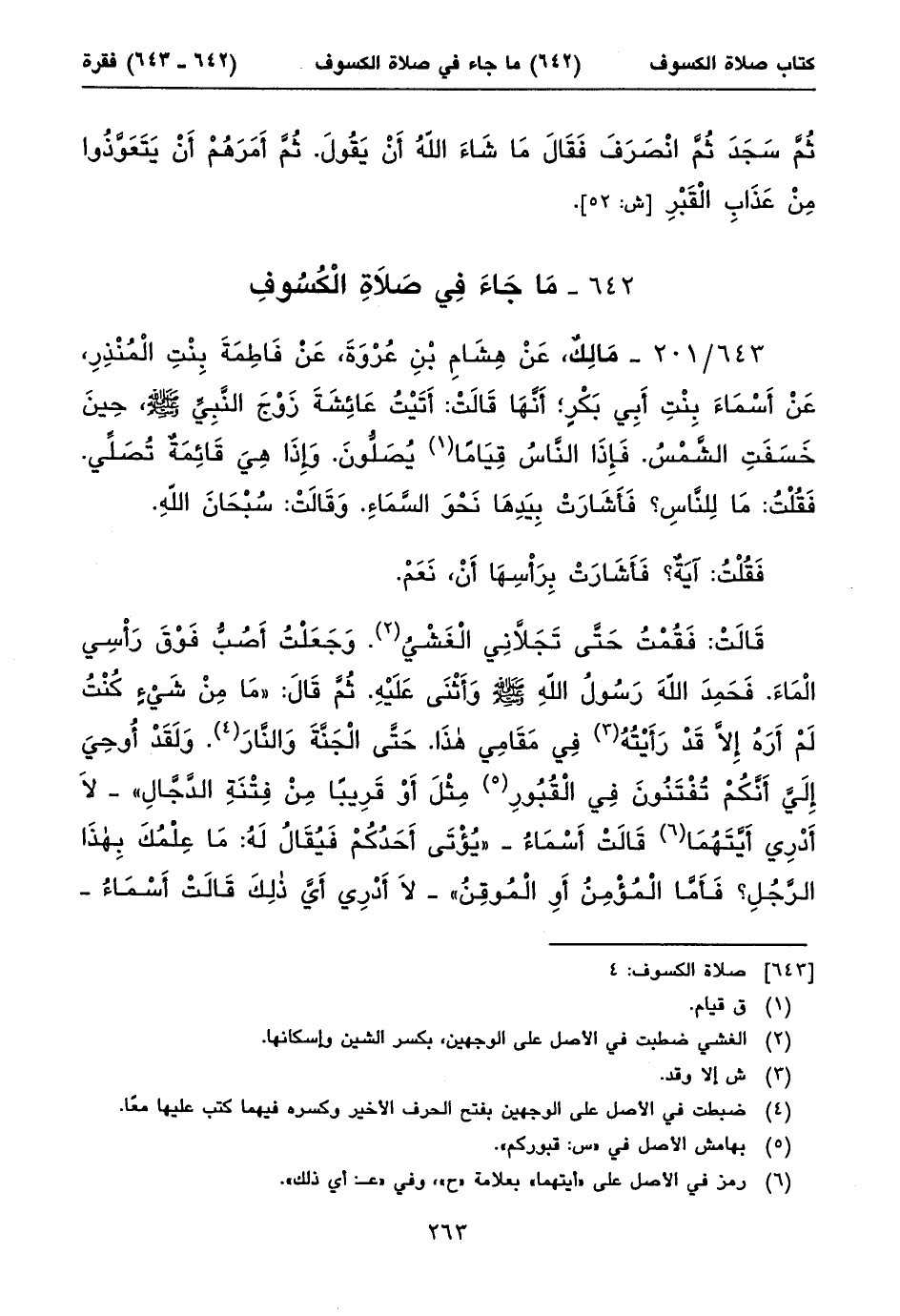 ٦٤٣/ ٢٠١ - مَالِكٌ، عَنْ هِشَامِ بْنِ عُرْوَةَ، عَنْ فَاطِمَةَ بِنْتِ الْمُنْذِرِ، عَنْ أَسْمَاءَ بِنْتِ أَبِي بَكْرٍ؛ أَنَّهَا قَالَتْ: أَتَيْتُ عَائِشَةَ زَوْجَ النَّبِيِّ صلى الله عليه وسلم، حِينَ خَسَفَتِ الشَّمْسُ. فَإِذَا النَّاسُ قِيَاماً (١) يُصَلُّونَ. وَإِذَا هِيَ قَائِمَةٌ تُصَلِّي. فَقُلْتُ: مَا لِلنَّاسِ؟ فَأَشَارَتْ بِيَدِهَا نَحْوَ السَّمَاءِ. وَقَالَتْ: سُبْحَانَ اللهِ.