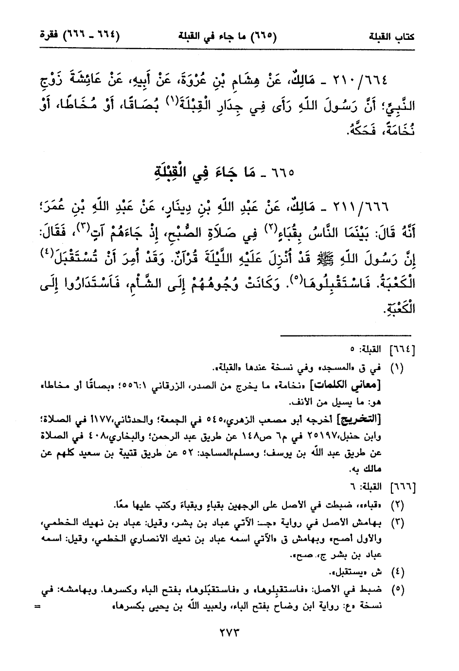 ٦٦٦/ ٢١١ - مَالِكٌ، عَنْ عَبْدِ اللهِ بْنِ دِينَارٍ، عَنْ عَبْدِ اللهِ بْنِ عُمَرَ؛ أَنَّهُ قَالَ: بَيْنَمَا النَّاسُ بِقُبَاءٍ (١) فِي صَلَاةِ الصُّبْحِ، إِذْ جَاءَهُمْ آتٍ (٢)، فَقَالَ: إِنَّ رَسُولَ اللهِ صلى الله عليه وسلم قَدْ أُنْزِلَ عَلَيْهِ اللَّيْلَةَ قُرْآنٌ. وَقَدْ أُمِرَ أَنْ تُسْتَقْبَلَ (٣) الْكَعْبَةُ. فَاسْتَقْبِلُوهَا (٤). وَكَانَتْ وُجُوهُهُمْ إِلَى الشَّأْمِ، فَاَسْتَدَارُوا إِلَى الْكَعْبَةِ.