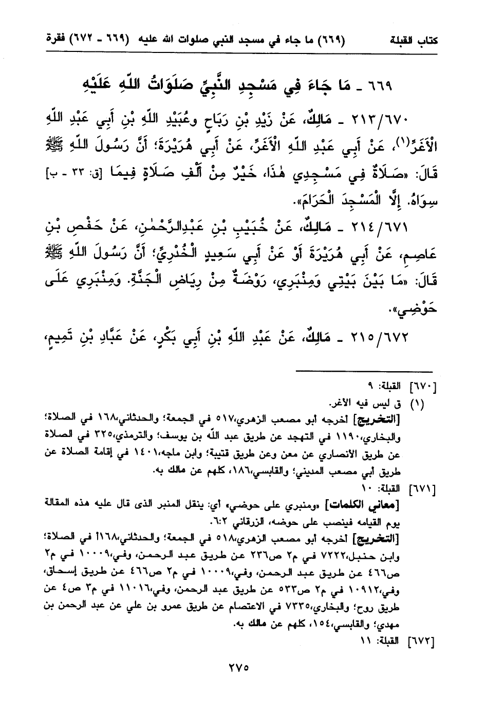٦٧١/ ٢١٤ - مَالِكٌ، عَنْ خُبَيْبِ بْنِ عَبْدِ الرَّحْمنِ، عَنْ حَفْصِ بْنِ عَاصِمِ، عَنْ أَبِي هُرَيْرَةَ أَوْ عَنْ أَبِي سَعِيدٍ الْخُدْرِيِّ؛ أَنَّ رَسُولَ اللهِ صلى الله عليه وسلم قَالَ: «مَا بَيْنَ بَيْتِي وَمِنْبَرِي، رَوْضَةٌ مِنْ رِيَاضِ الْجَنَّةِ. وَمِنْبَرِي عَلَى حَوْضِي».