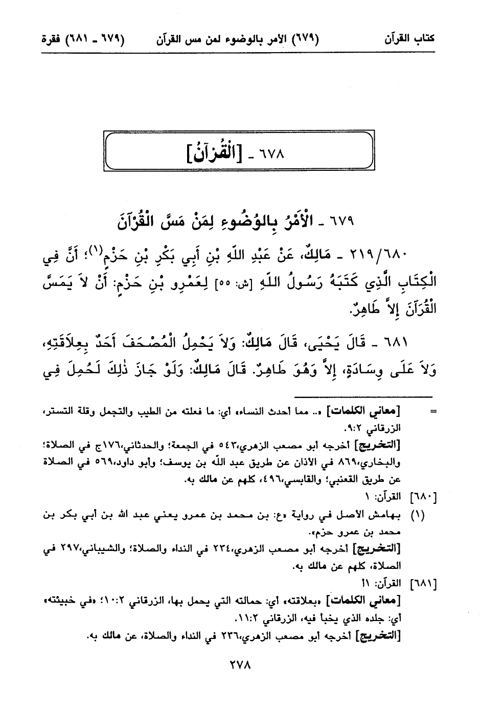 ٦٨٠/ ٢١٩ - مَالِكٌ، عَنْ عَبْدِ اللهِ بْنِ أَبِي بَكْرِ بْنِ حَزْمٍ (١)؛ أَنَّ فِي الْكِتَابِ الَّذِي كَتَبَهُ رَسُولُ اللهِ [ش: ٥٥] لِعَمْرِو بْنِ حَزْمٍ: أَنْ لَا يَمَسَّ الْقُرَآنَ إِلَاّ طَاهِرٌ.