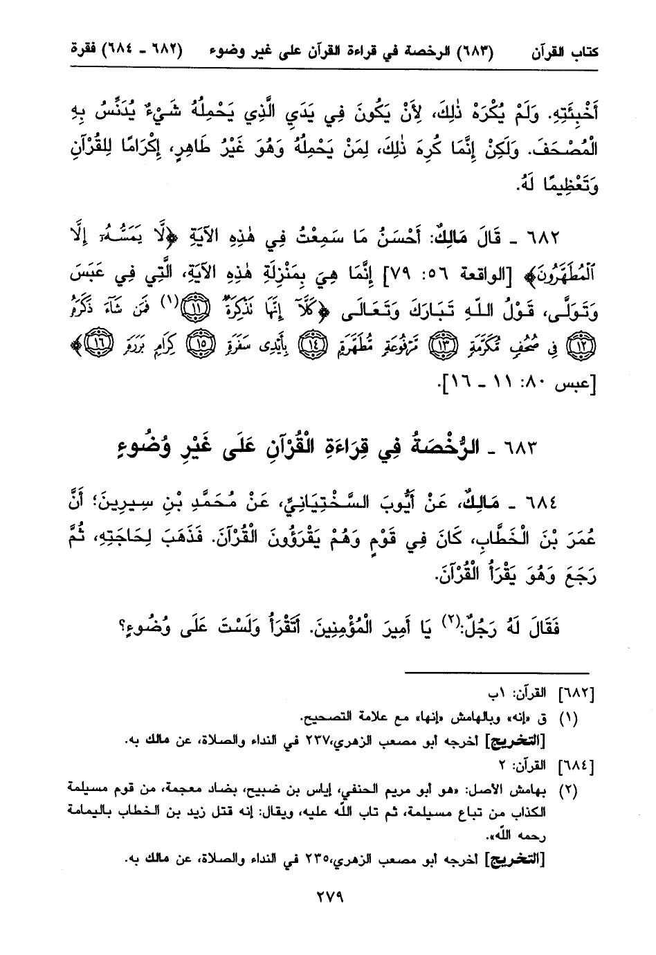 ٦٨٢ - قَالَ مَالِكٌ: أَحْسَنُ مَا سَمِعْتُ فِي هذِهِ الآيَةِ {لا يَمَسُّهُ إِلاّ المُطَهَّرُونَ} [الواقعة ٥٦: ٧٩] إِنَّمَا هِيَ بِمَنْزِلَةِ هذِهِ الآيَةِ، الَّتِي فِي عَبَسَ وَتَوَلَّى، قَوْلُ اللهِ تَبَارَكَ وَتَعَالَى {كَلاّ إِنَّهَا تّذْكِرَةٌ، (١) فَمَن شَاءَ ذَكَرَهُ، فِي صُحُفٍ مُكَرَّمَةٍ، مَرْفُوعَةٍ مُطَهَّرَةٍ، بِأَيْدِي سَفَرَةٍ، كِرَامٍ بَرَرَةٍ} [عبس ٨٠: ١١ - ١٦].