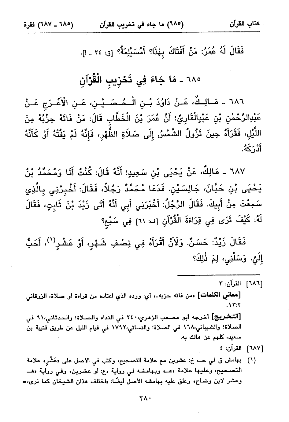 فَقَالَ زَيْدٌ: حَسَنٌ. وَلأَنْ أَقْرَأَهُ فِي نِصْفِ شَهْرٍ، أَوْ عَشْرٍ (١)، أَحَبُّ إِلَيَّ. وَسَلْنِي، لِمَ ذلِكَ؟ ⦗٢٨١⦘