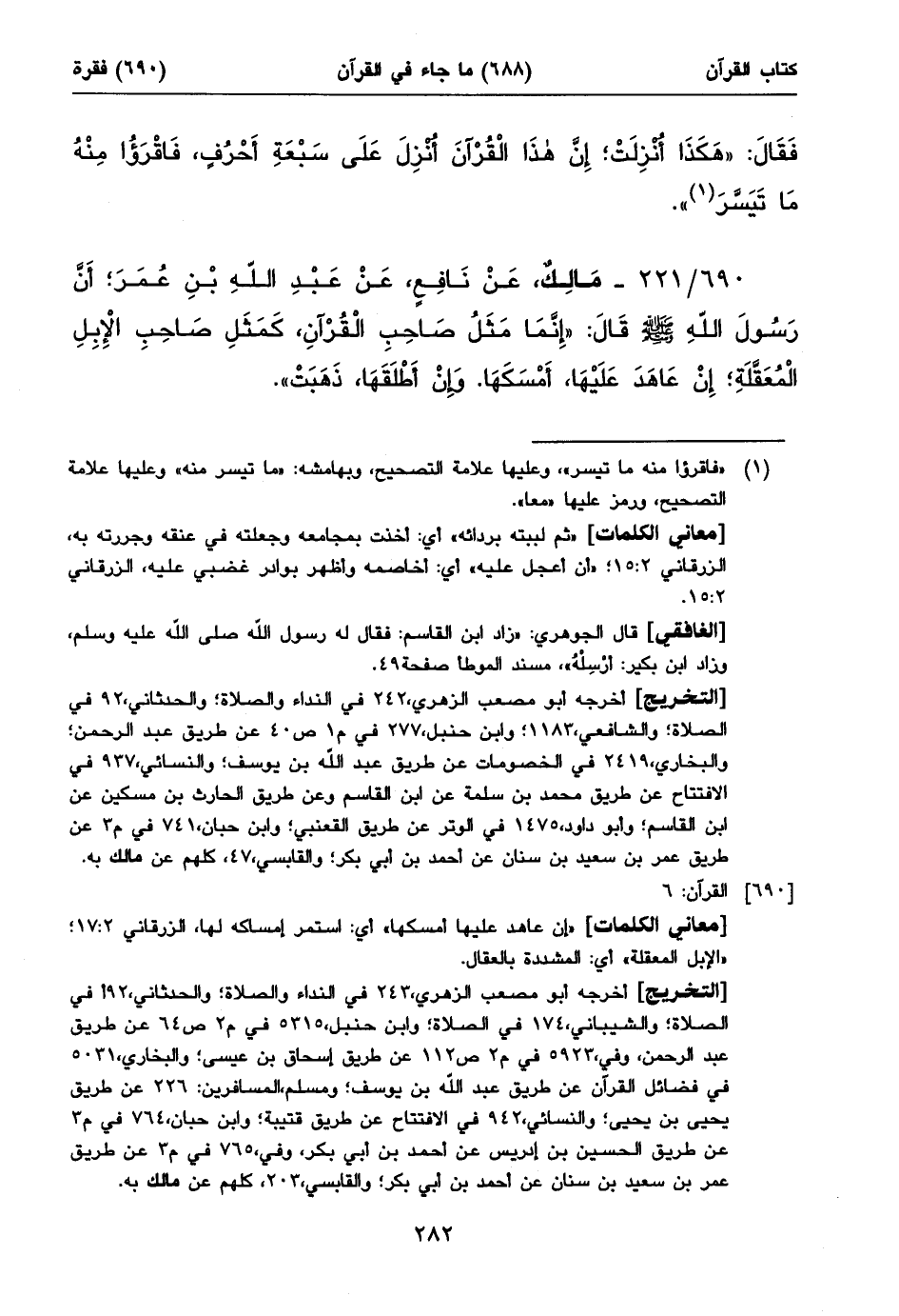 ٦٩٠/ ٢٢١ - مَالِكٌ، عَنْ نَافِعٍ، عَنْ عَبْدِ اللهِ بْنِ عُمَرَ؛ أَنَّ رَسُولَ اللهِ صلى الله عليه وسلم قَالَ: «إِنَّمَا مَثَلُ صَاحِبِ الْقُرْآنِ، كَمَثَلِ صَاحِبِ الْإِبِلِ الْمُعَقَّلَةِ؛ إِنْ عَاهَدَ عَلَيْهَا، أَمْسَكَهَا. وَإِنْ أَطْلَقَهَا، ذَهَبَتْ».